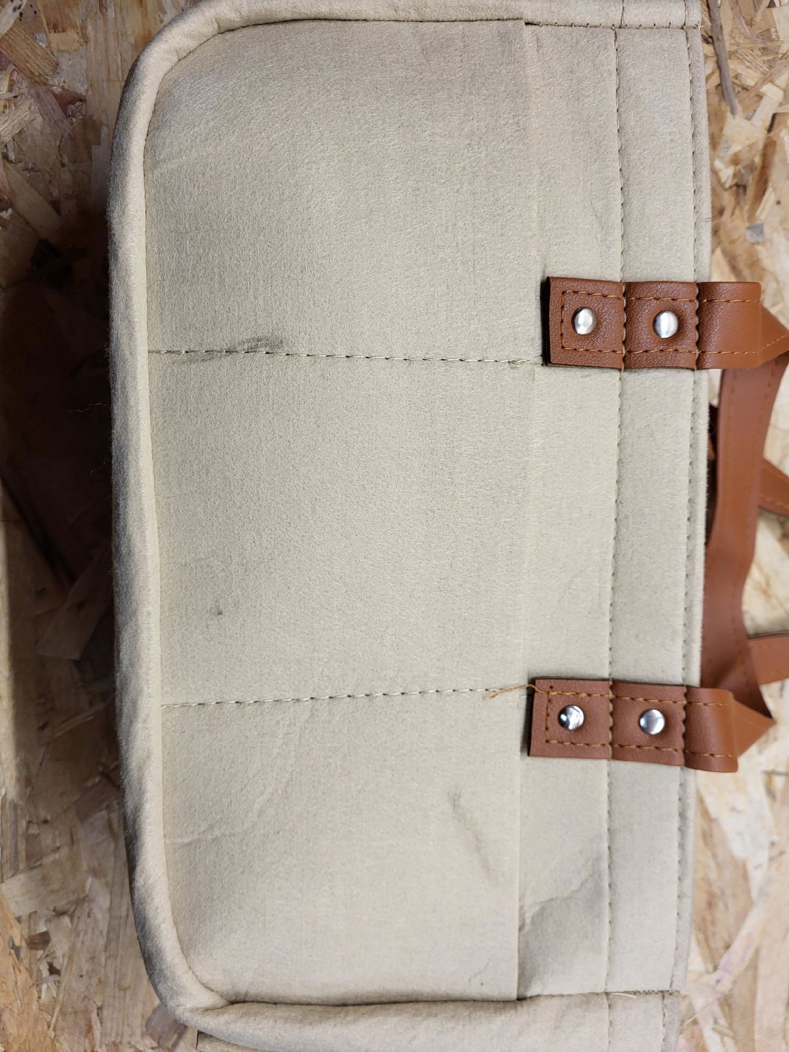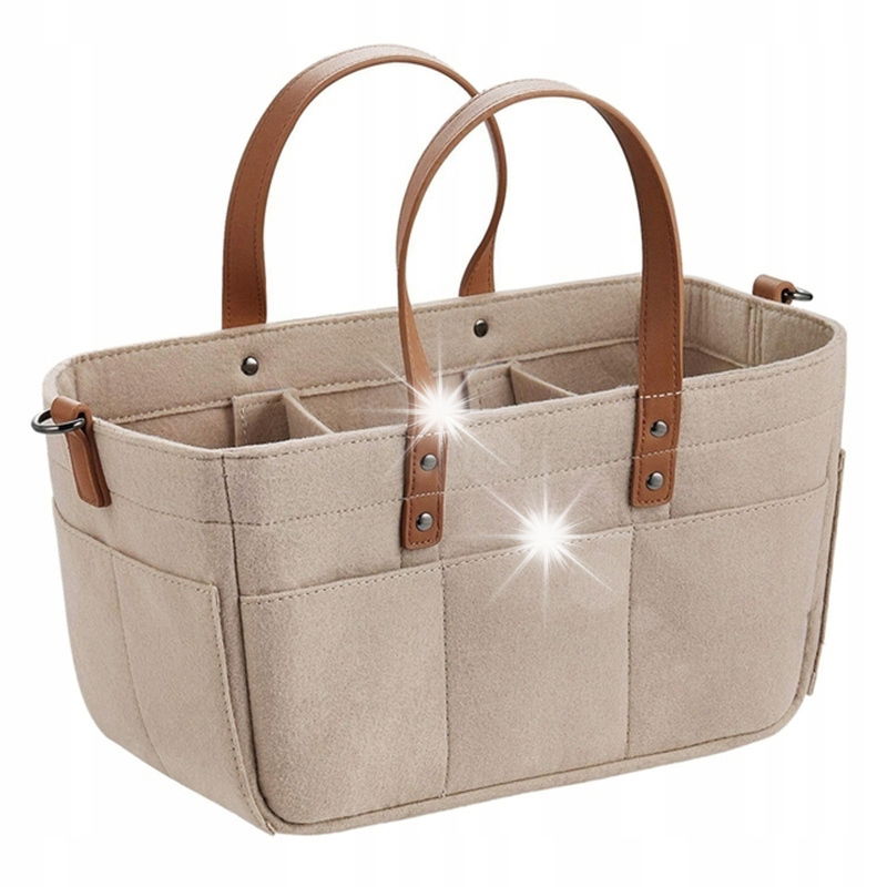 - Materiał: Gęsto tkany, trwały filc o ponadczasowym beżowym kolorze. Gwarantuje długą żywotność torby oraz jej estetyczny wygląd.