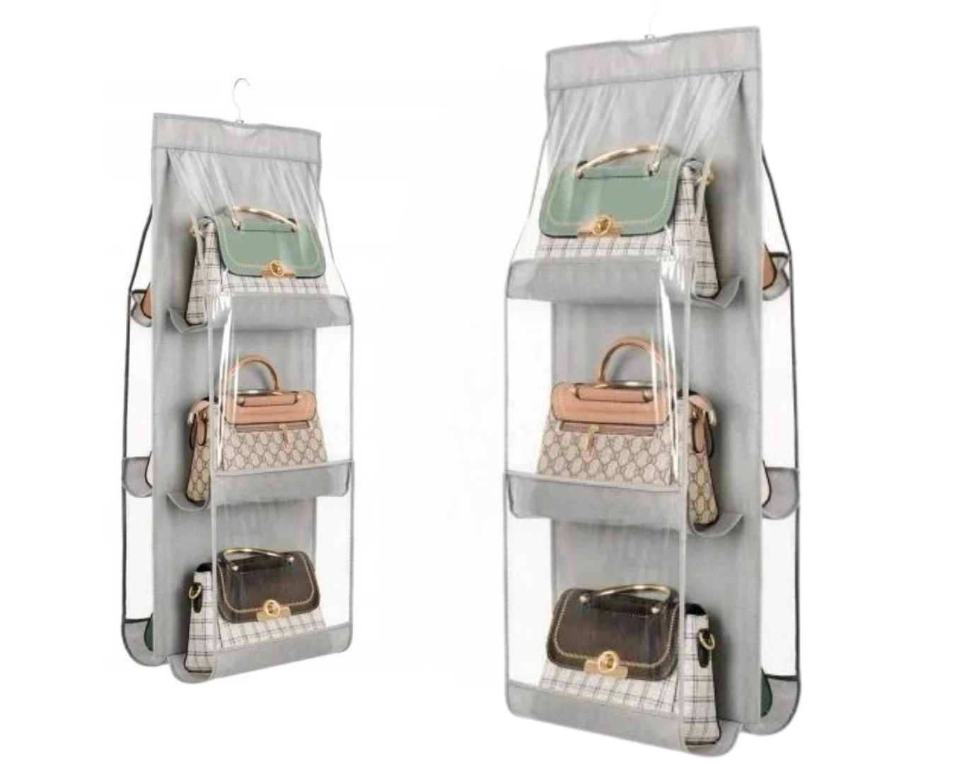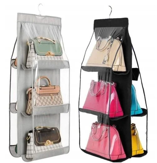 Organizer posiada 6 przezroczystych kieszeni, w których możesz pomieścić nawet do 16 torebek. Dodatkowo w zestawie znajduje się metalowy wieszak do zawieszenia.