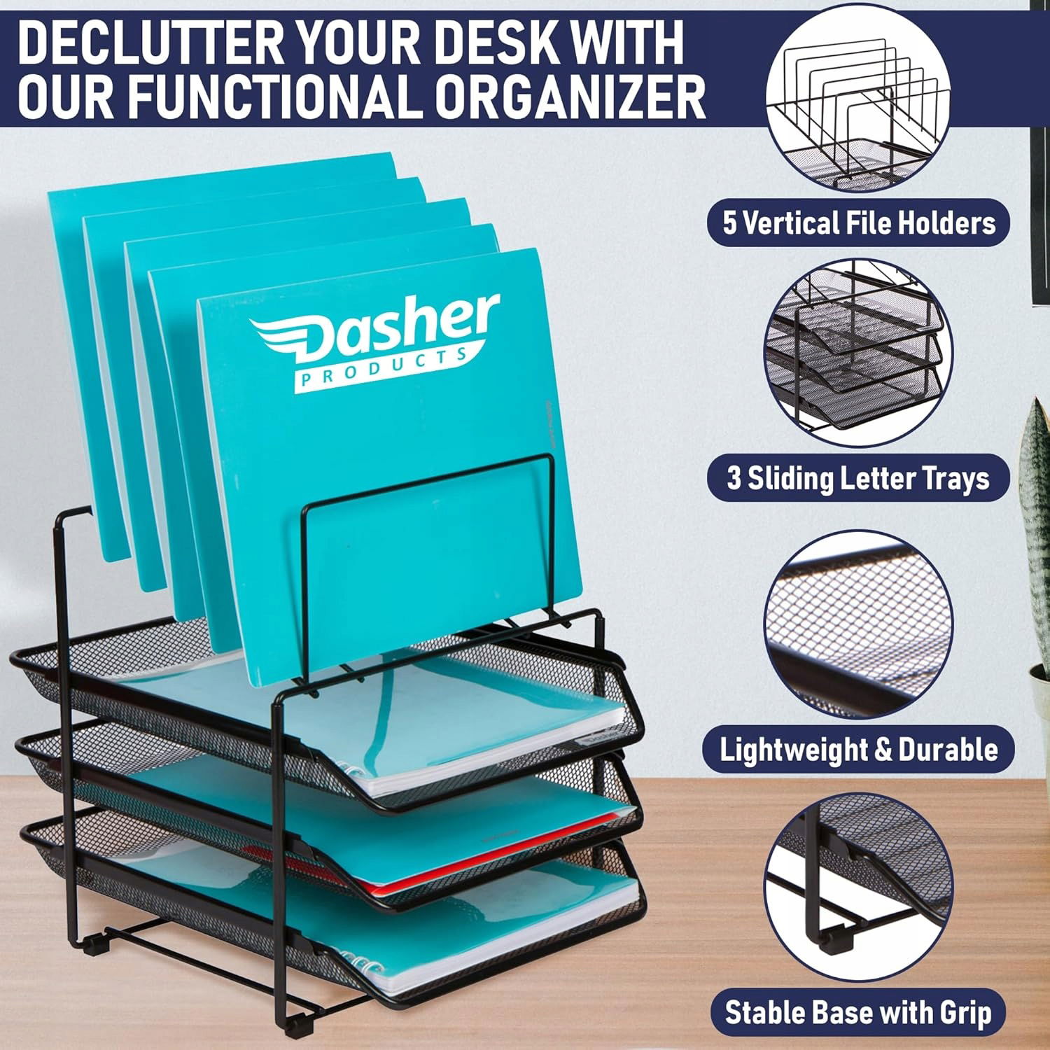 Siatkowy organizer na biurko i do przechowywania – organizer biurowy z 3 wysuwanymi tackami na dokumenty i 5 pionowymi uchwytami na dokumenty, stojak na segregatory, teczki i podkładki. Stalowe tacki na dokumenty z siatki do organizacji biurka