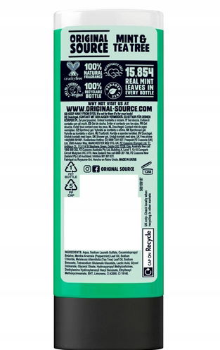 Original Source Mint and Tea Tree Shower Gel 500ml to orzeźwiający i pobudzający żel pod prysznic, który łączy w sobie chłód mięty i oczyszczającą moc drzewa herbacianego z codzienną pielęgnacją.