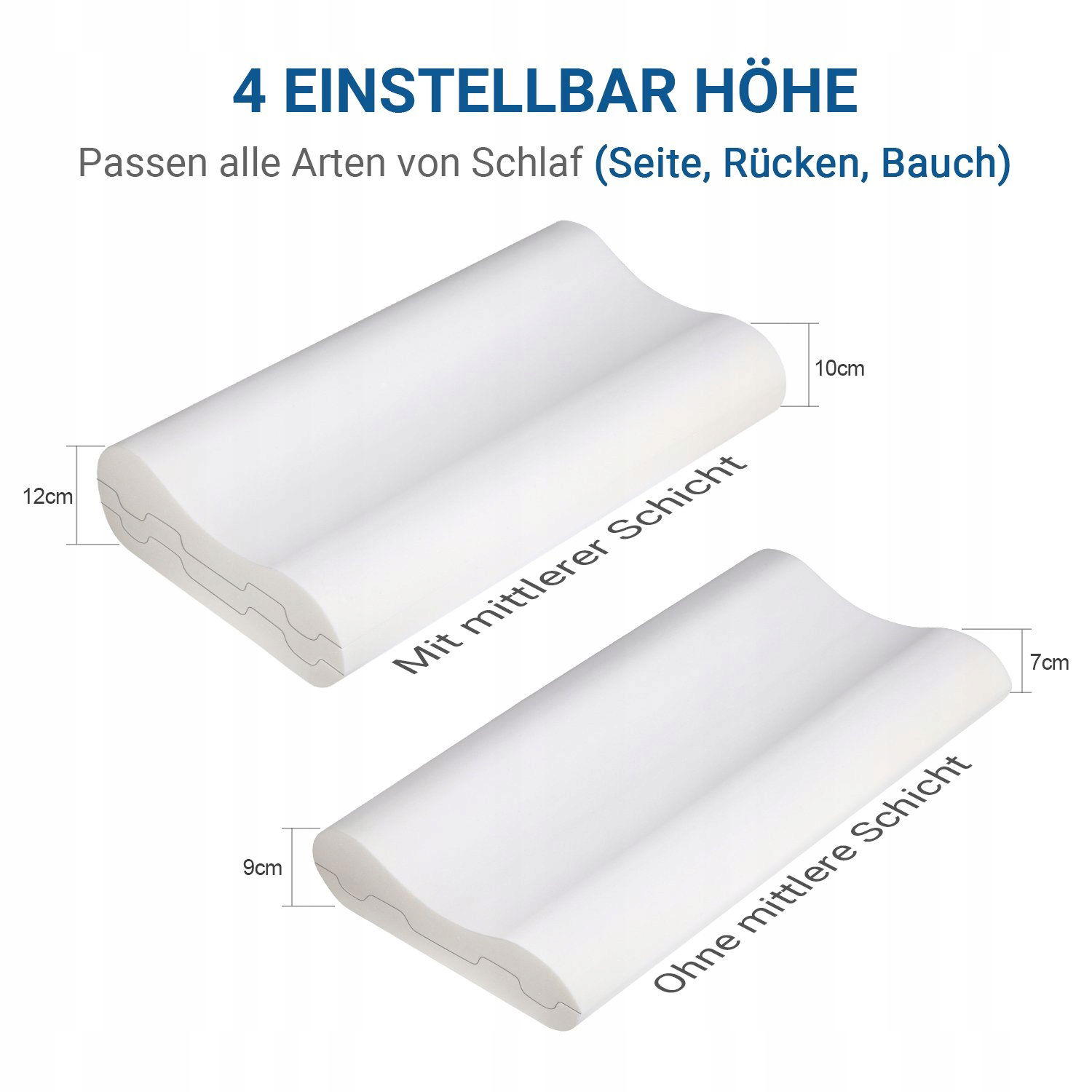 【REGULOWANE WARSTWY】 Wymiary produktu: 60 × 36 × 12/10 cm. Ortopedyczna poduszka do spania ma pierwotnie 12 cm i 10 cm wysokości. Jeśli usuniesz środkową warstwę pianki, otrzymasz 9 cm i 7 cm wysokości. Idealny dla wszystkich rodzajów podkładów (bok/tył/brzuch).