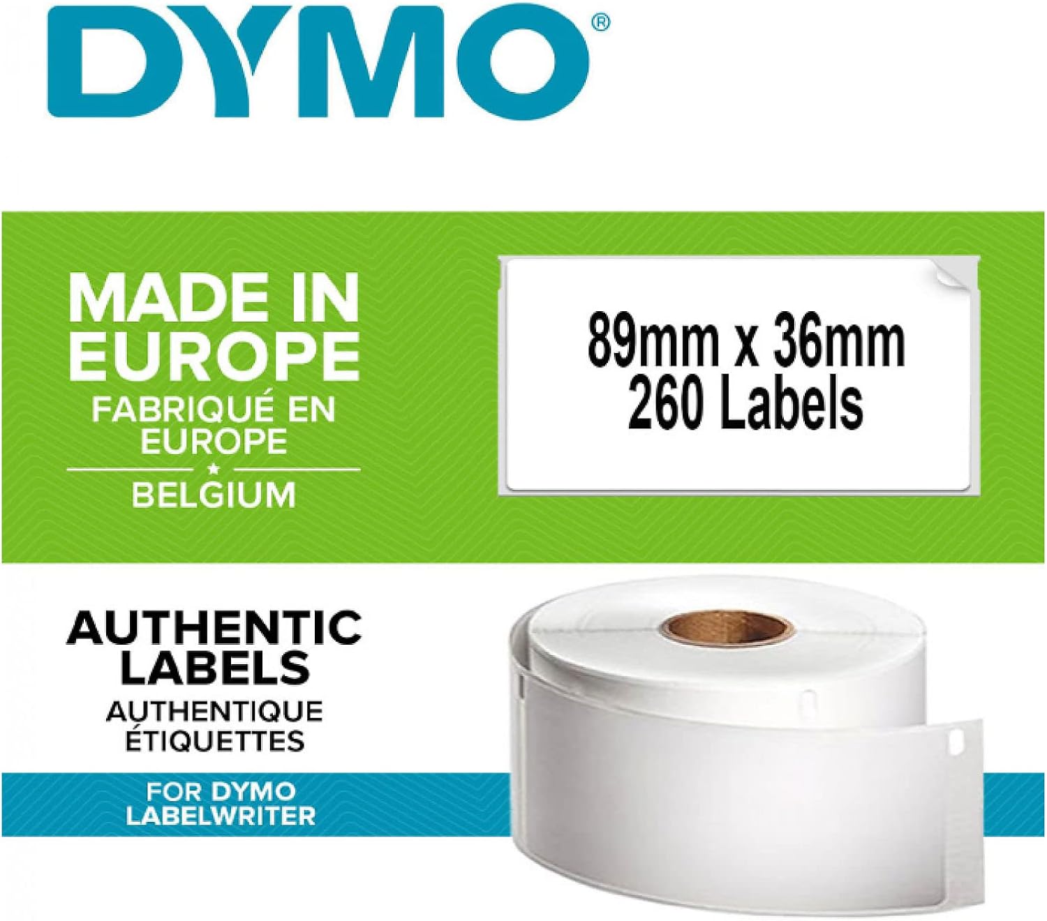 Oryginalne duże etykiety adresowe DYMO LabelWriter | 36 mm x 89 mm | Rolka 260 szt. | Czarny nadruk na białym tle | do drukarek etykiet LabelWriter