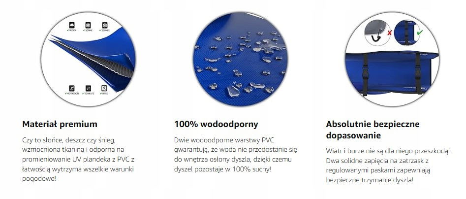 Trwała – Podwójny materiał ze wzmocnioną warstwą termoplastyczną zmniejsza zużycie osłony dyszla. Szwy krawędziowe wykonane z materiału odpornego na promieniowanie UV dodatkowo wydłużają żywotność osłony dyszla.