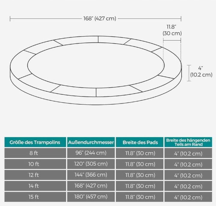 Ta poduszka ochronna o standardowym rozmiarze (średnica zewnętrzna: 427 cm, średnica wewnętrzna: 367 cm), o szerokości 30 cm i grubości 1,5 cm, jest kompatybilna z większością okrągłych trampolin tego samego rozmiaru