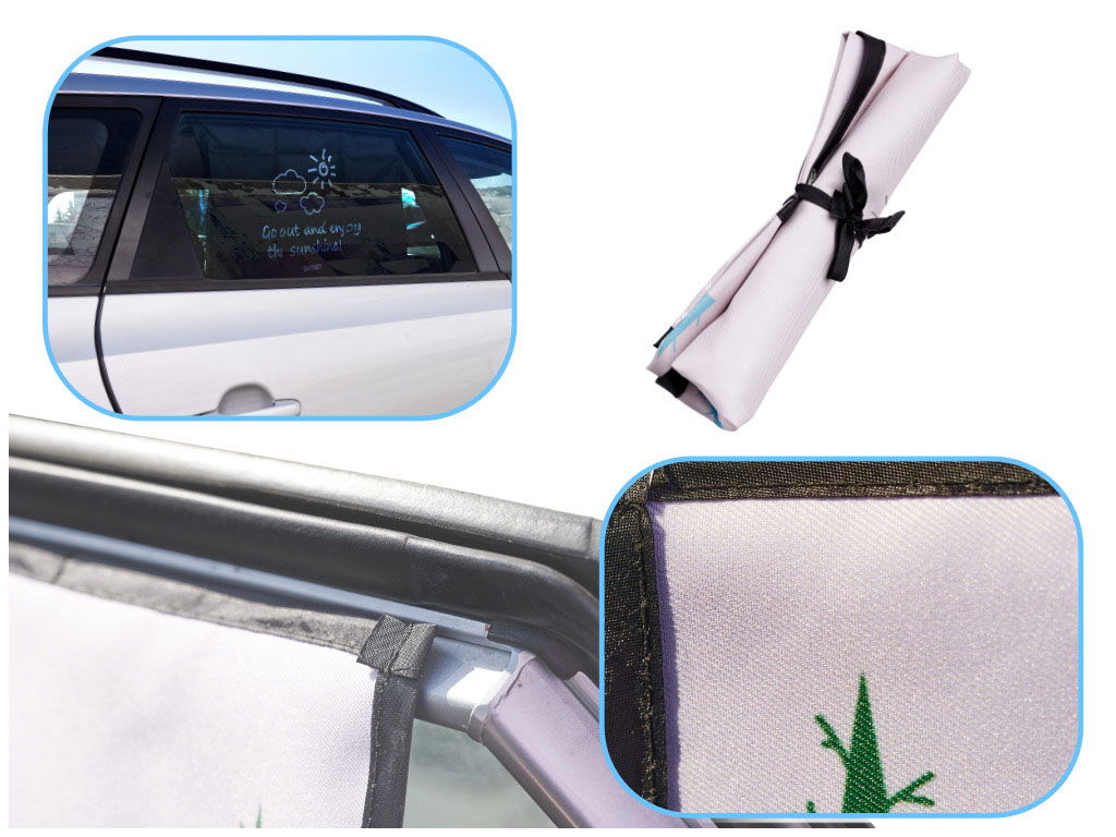 TRWAŁY MATERIAŁ I UNIWERSALNE ZASTOSOWANIE - Kurtyna wykonana jest z dwuwarstwowej tkaniny, co gwarantuje pełne zaciemnienie i trwałość. Z jednej strony znajduje się dekoracyjna grafika, a z drugiej napis na czarnym tle, co sprawia, że osłona pasuje do każdego wnętrza samochodu. Można ją łatwo zdjąć i przechować, zajmuje niewiele miejsca.