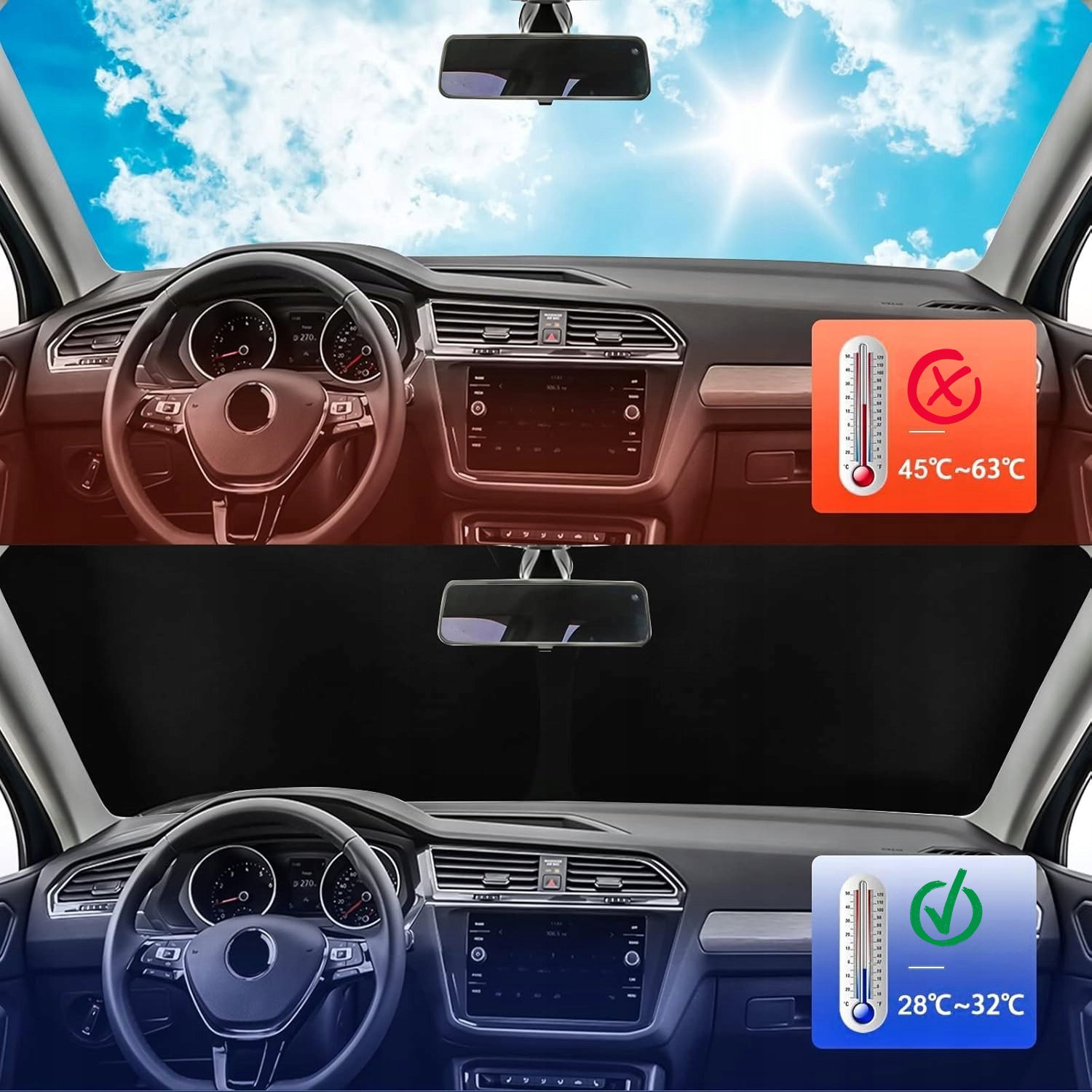 - Ochrona przed temperaturą i UV: osłona skutecznie redukuje temperaturę wewnątrz pojazdu, ograniczając nagrzewanie nawet o kilkadziesiąt stopni. Chroni przed promieniowaniem UV, podczerwienią oraz intensywnym światłem słonecznym, co przekłada się na większy komfort użytkowania. Pomaga utrzymać chłodne powierzchnie, takie jak kierownica czy siedzenia.