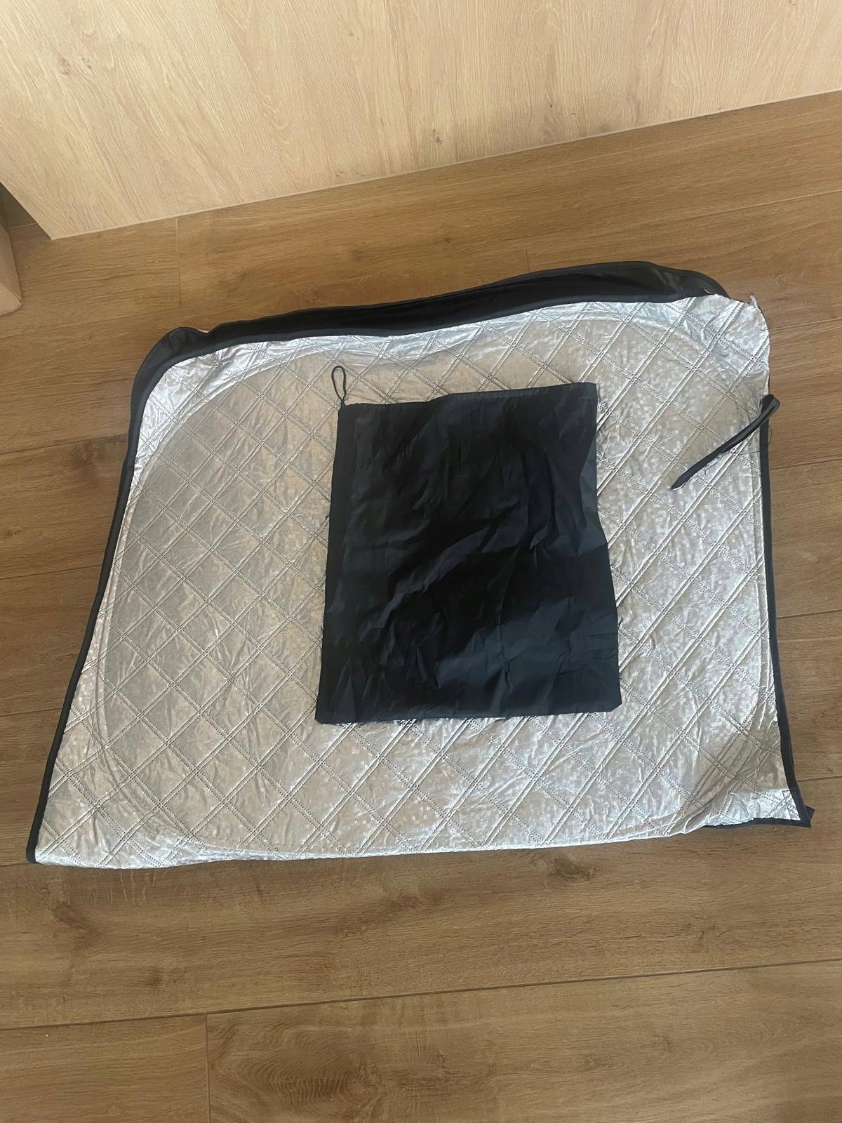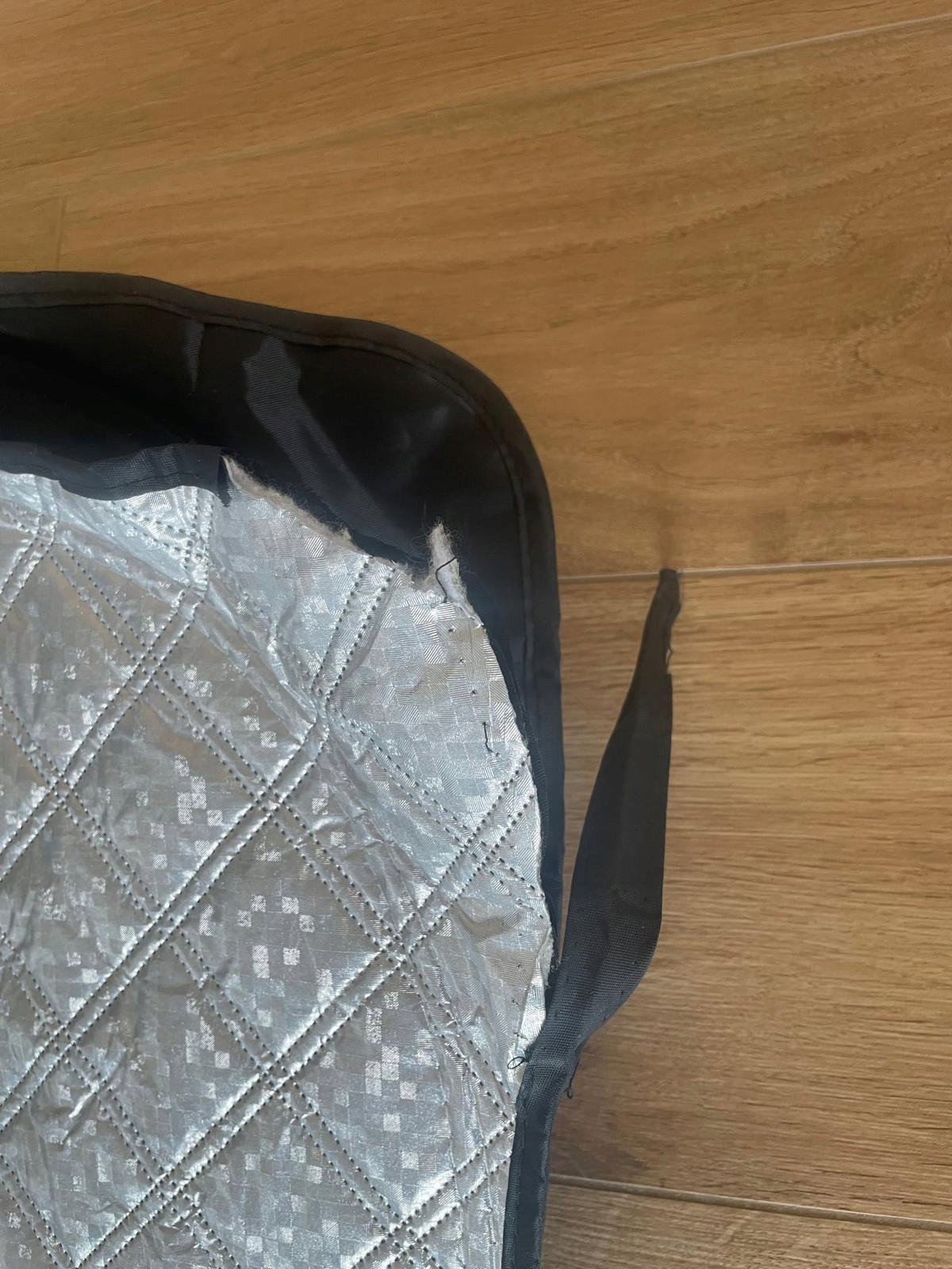 - Materiał: osłona wykonana jest z wielowarstwowego poliestru z powłoką odblaskową, który skutecznie odbija promienie słoneczne. Wewnętrzna warstwa w kolorze czarnym wspiera izolację i ogranicza przenikanie ciepła do wnętrza. Zastosowane materiały cechują się odpornością na zużycie, wilgoć oraz wysoką temperaturę.