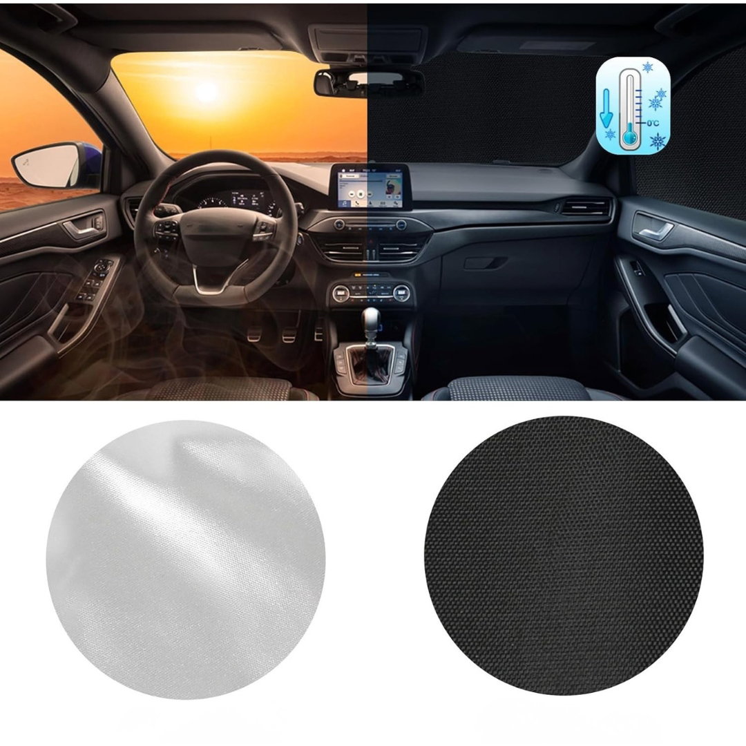 Produkt jest trwały, całorocznie chroni przed nadmiernym ciepłem latem i utratą ciepła zimą, zwiększa prywatność w pojeździe, a montaż odbywa się łatwo dzięki bocznym klapom i zamknięciom przy lusterkach, które utrzymują osłonę na miejscu nawet przy wietrze.