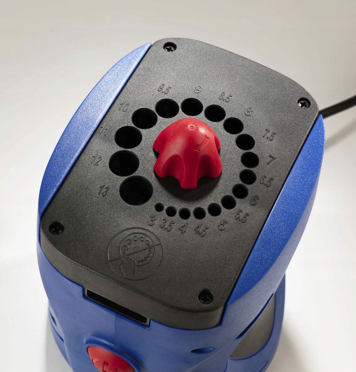 Metal i wióry, które są zeskrobane automatycznie trafiają do poręcznego pojemnika do ostrzenia. Pojemnik zbiorczy można łatwo opróżnić. Dzięki specjalnej konstrukcji szlifierskiej szlifujesz zawsze pod odpowiednim kątem. Urządzenie ostrzące jest również stabilne i wolne od wibracji dzięki 5 wytrzymałym gumowym nóżkom.