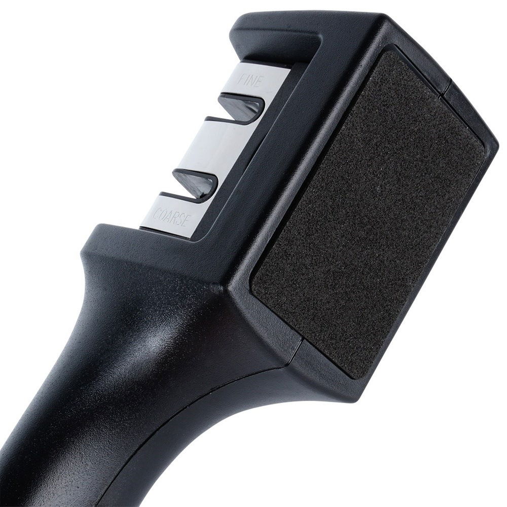 PRAKTYCZNA - Ostrzałka posiada dwie głowice: węglową do ostrzenia oraz ceramiczną do polerowania. Nadaje się do prostych noży kuchennych, np. szefa kuchni.