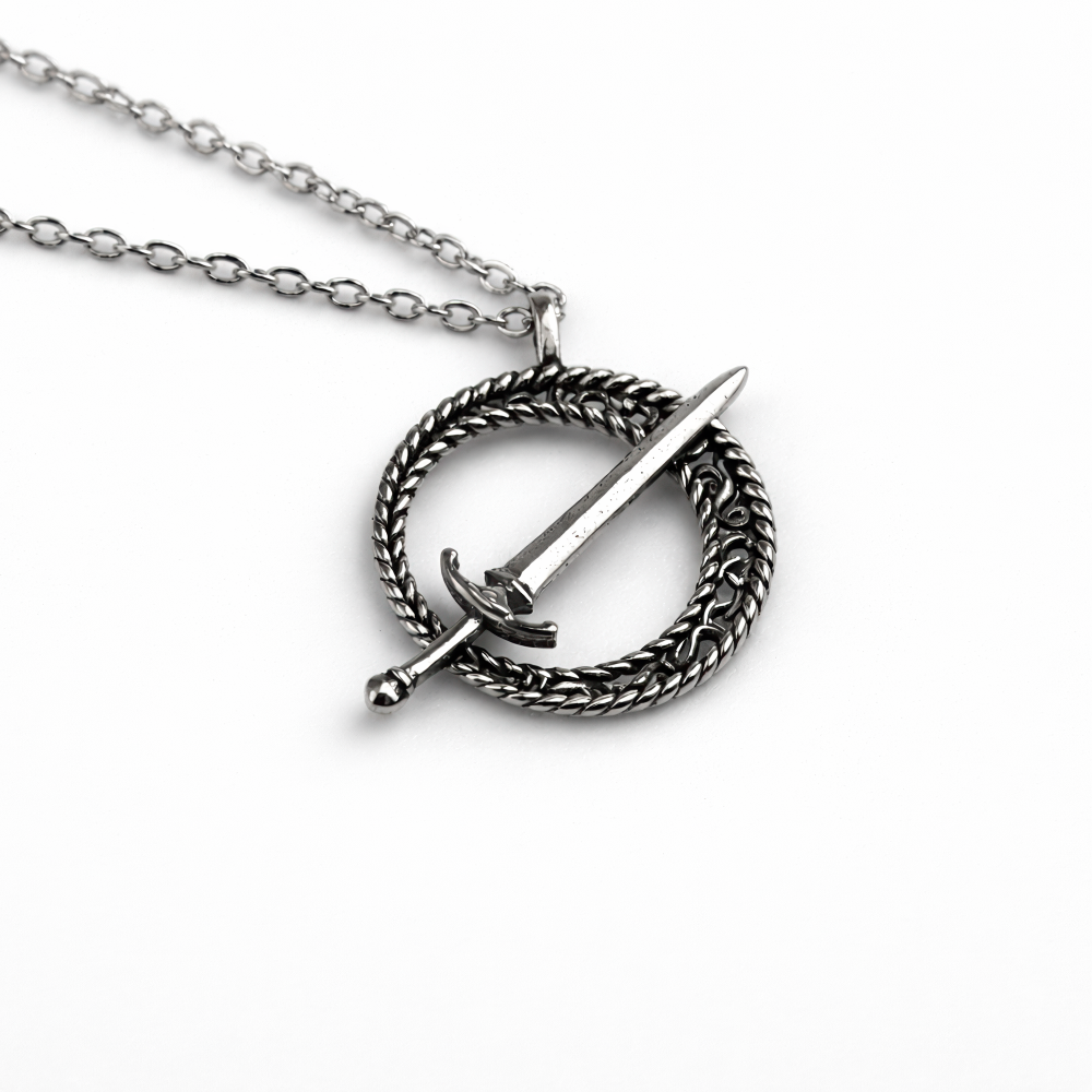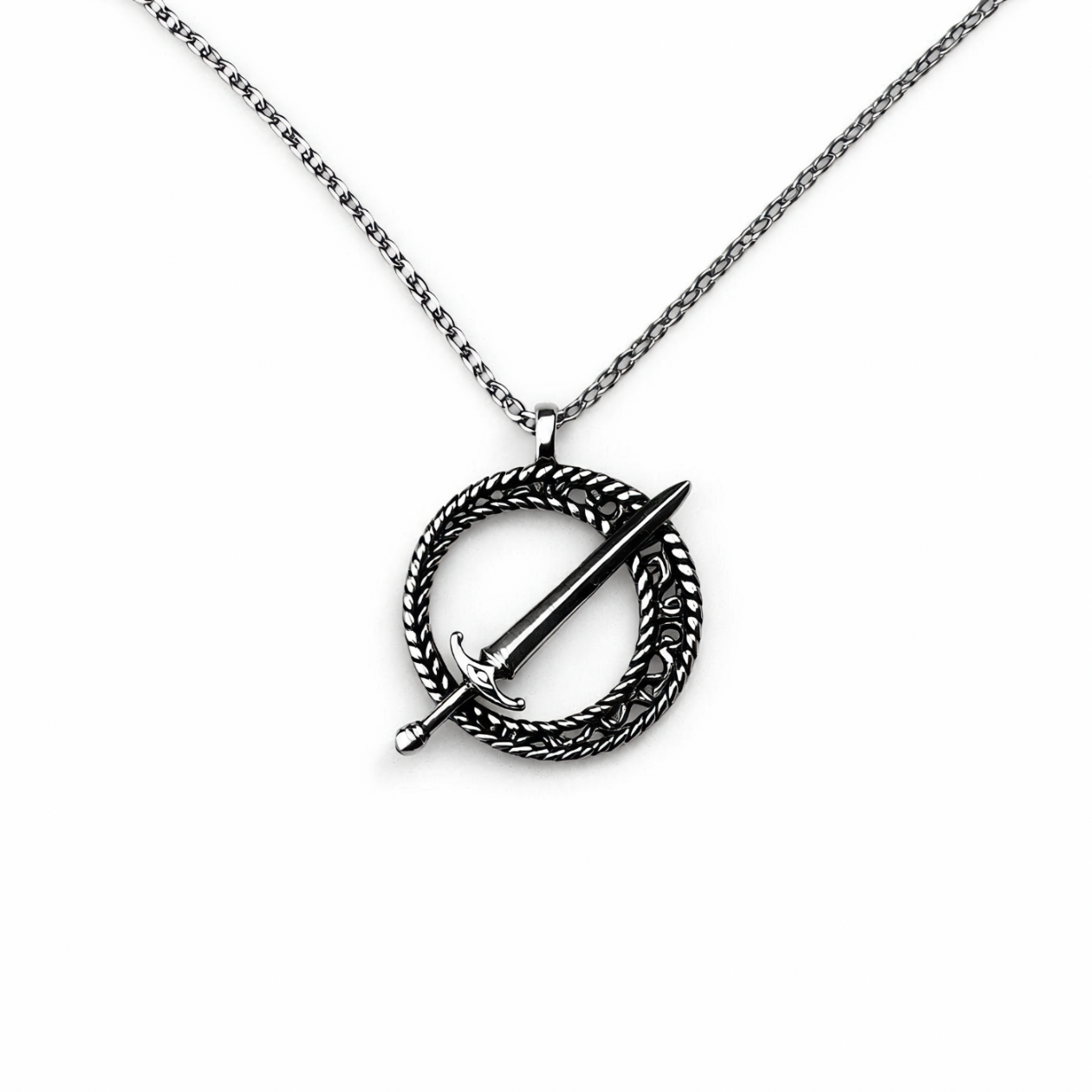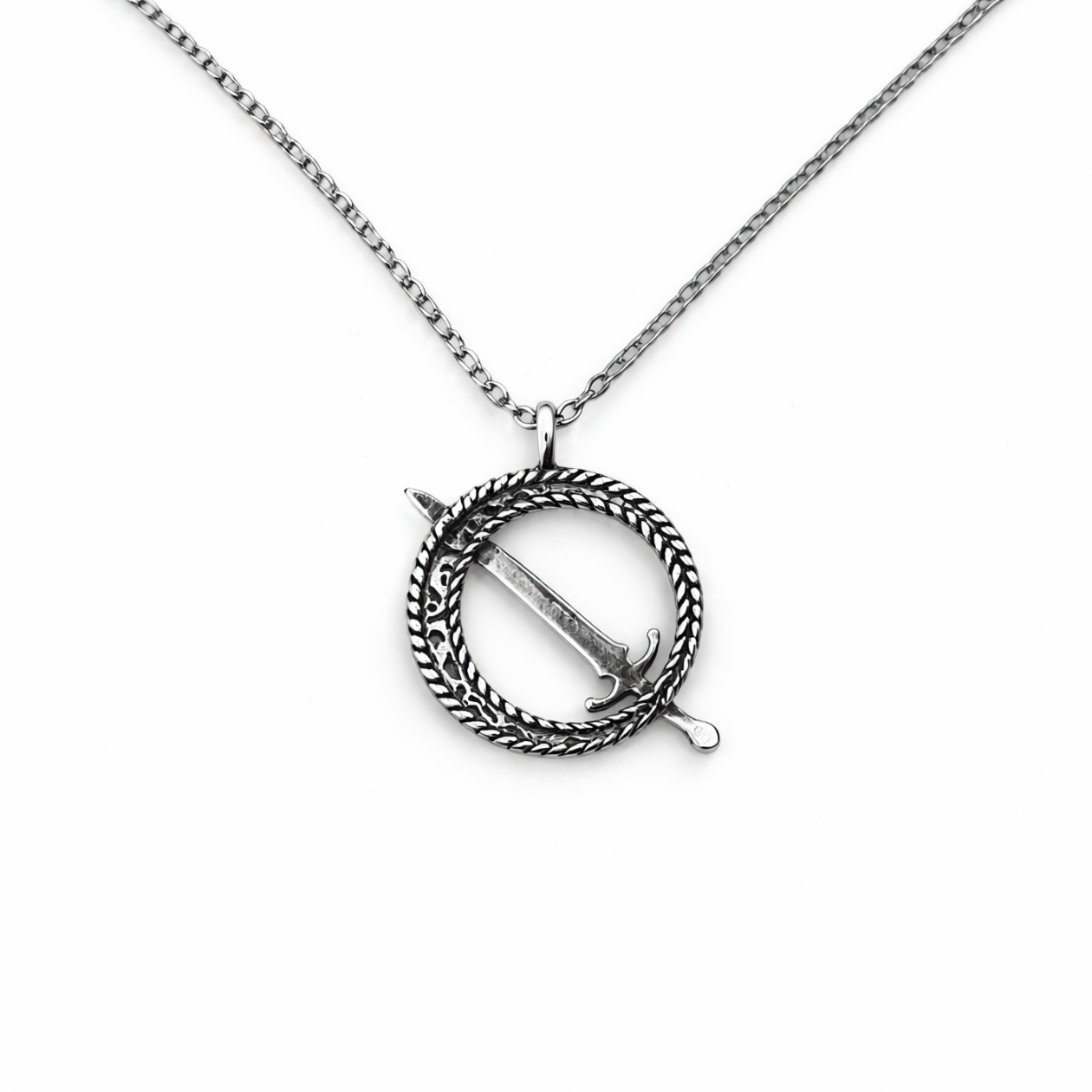 Uwolnij legendarną moc Ostrza Mrocznego Księżyca w codziennym stylu dzięki tej starannie wykonanej zawieszce. Ręcznie wykończona w uderzającym, metalicznym odcieniu srebra, okrągła zawieszka o średnicy 4 cm zawiera ikoniczny miecz umieszczony po przekątnej w centrum ramki. Zaprojektowana, by uchwycić eteryczną esencję broni z Dark Souls 3, skomplikowane detale precyzyjnie oddają charakterystyczne zakrzywione ostrze, bogato zdobioną rękojeść i zakrzywioną gardę. Teksturowana powierzchnia podkreśla postarzony, ręcznie wykonany wygląd, z subtelnymi żebrami wzdłuż ostrza i delikatnymi liniami biegnącymi wokół okrągłej krawędzi – nawiązującymi do mistycznej Ćmy Księżycowej, która uosabia pochodzenie ostrza. Zawieszka zawieszona jest na solidnym, dopasowanym łańcuszku w odcieniu srebra, łącząc autentyczny lore gry z trwałą jakością wykonania. Każdy element, od precyzyjnego zarysu miecza po symboliczną strukturę pierścienia, oddaje hołd Artoriasowi, Wędrowcowi w Otchłani, i mrocznej mocy Mrocznego Księżyca. Idealna dla fanów poszukujących subtelnego, a zarazem znaczącego kawałka historii Dark Souls, który będą mogli nosić blisko serca.