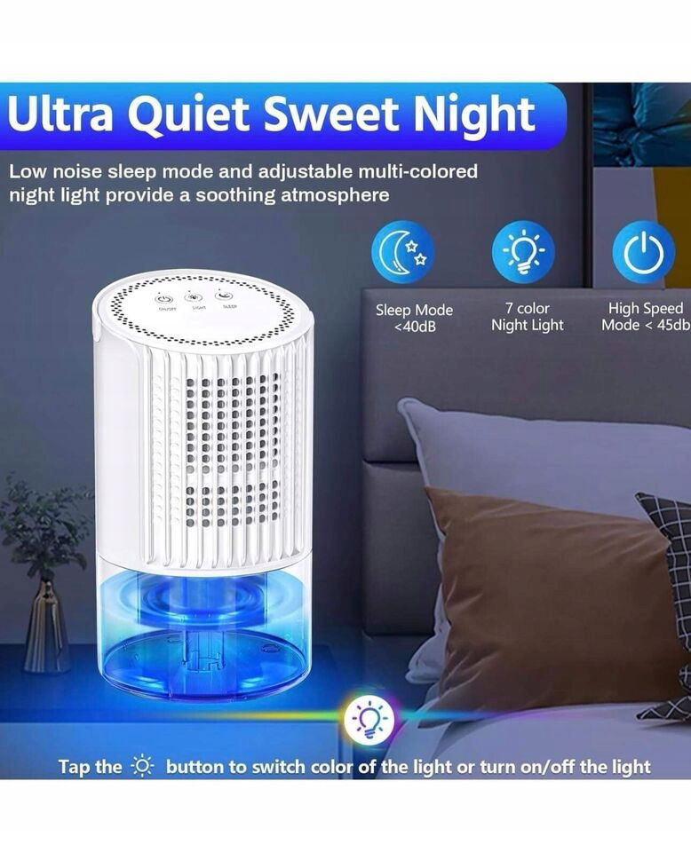 - * Osuszacz z cichą pracą: Nasze osuszacze do pokoju zostały zaprojektowane z cichym trybem uśpienia 35dB z timerem i trybem wysokiej mocy, aby spełnić różne potrzeby, tryb uśpienia basowego tego małego osuszacza pozwala spać i uczyć się bez żadnych zakłóceń. A te przenośne osuszacze z automatycznym oświetleniem atmosfery tworzą słodką i romantyczną nocną atmosferę. Możesz także wybrać swój ulubiony kolor lub go wyłączyć.