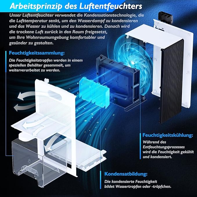 - Kompaktowy i przenośny: nasz osuszacz jest kompaktowy i przenośny i idealnie nadaje się do stosowania w różnych pomieszczeniach, takich jak kuchnia, łazienka, sypialnia, piwnica i garaż. Można go również łatwo transportować i używać w różnych miejscach.