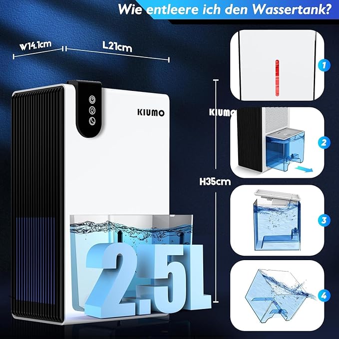Kiumo osuszacz powietrza (30 m²), 2,5 l, do kampera, sypialni, łazienki i innych małych pomieszczeń, funkcja automatycznego wyłączania, 2 tryby pracy diody LED w 7 kolorach