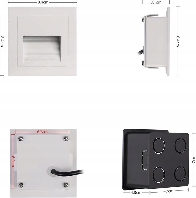 Wymiary: wymiary zewnętrzne ok. 84x84x32 mm // wymiary montażowe 70x70x48 mm (puszki instalacyjne/rozdzielcze).