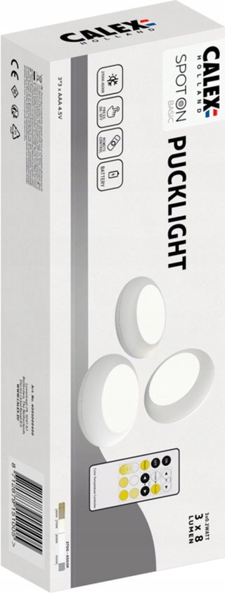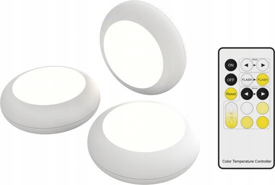 Calex Spot On to zestaw trzech bezprzewodowych lamp LED, które można łatwo przytwierdzić do różnych powierzchni dzięki magnesom i taśmie 3M. Zasilane bateriami, bez konieczności instalacji elektrycznej. Po naciśnięciu lub z pilota (zasięg do 15 m) światło można włączać/wyłączać i regulować temperaturę barwową (od ciepłej 2700 K do zimnej 6500 K). Zestaw generuje mocne, 25-lumenowe oświetlenie, idealne do wnętrz, szafek, półek i podświetlenia dekoracyjnego.