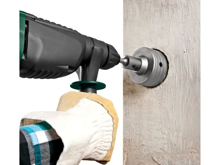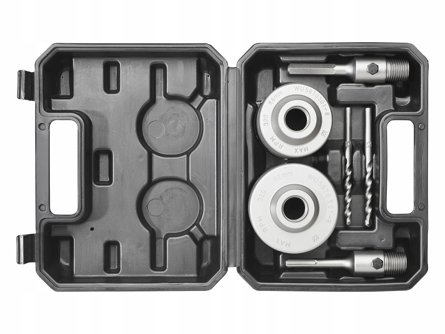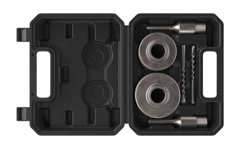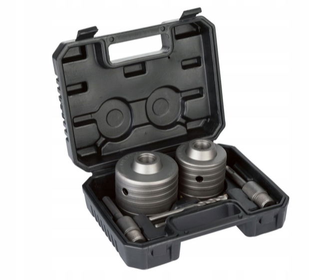Zawartość: 1 wiertło ok. 82 mm, 8 zębów. 1 wiertło ok. 68 mm, 6 zębów. 1 adapter z chwytem sześciokątnym ok. 110 x 26 mm. 1 adapter z zaciskiem SDS plus ok. 110 x 26 mm. 2 wiertła centrujące ok. 110 x 8 mm.