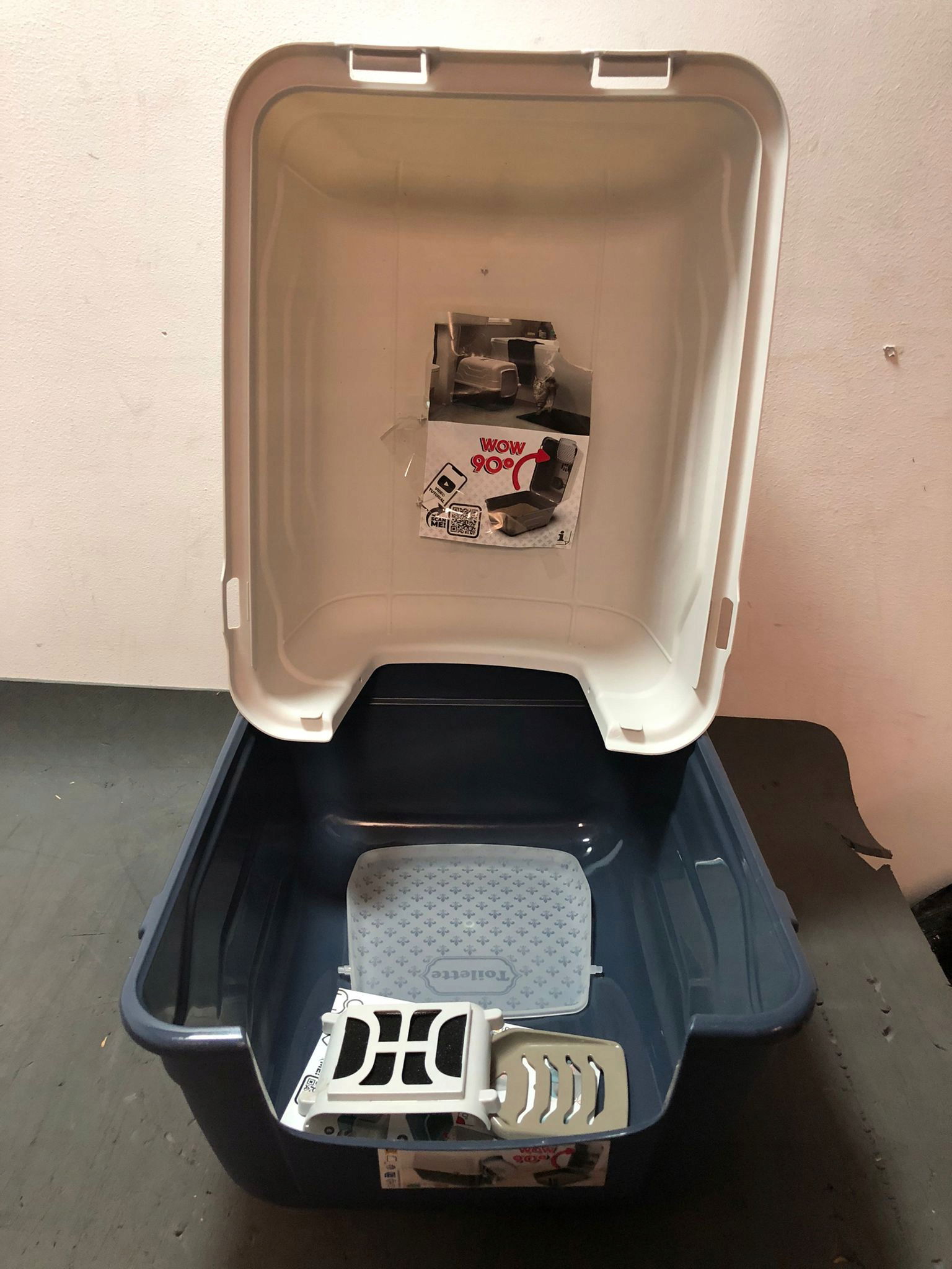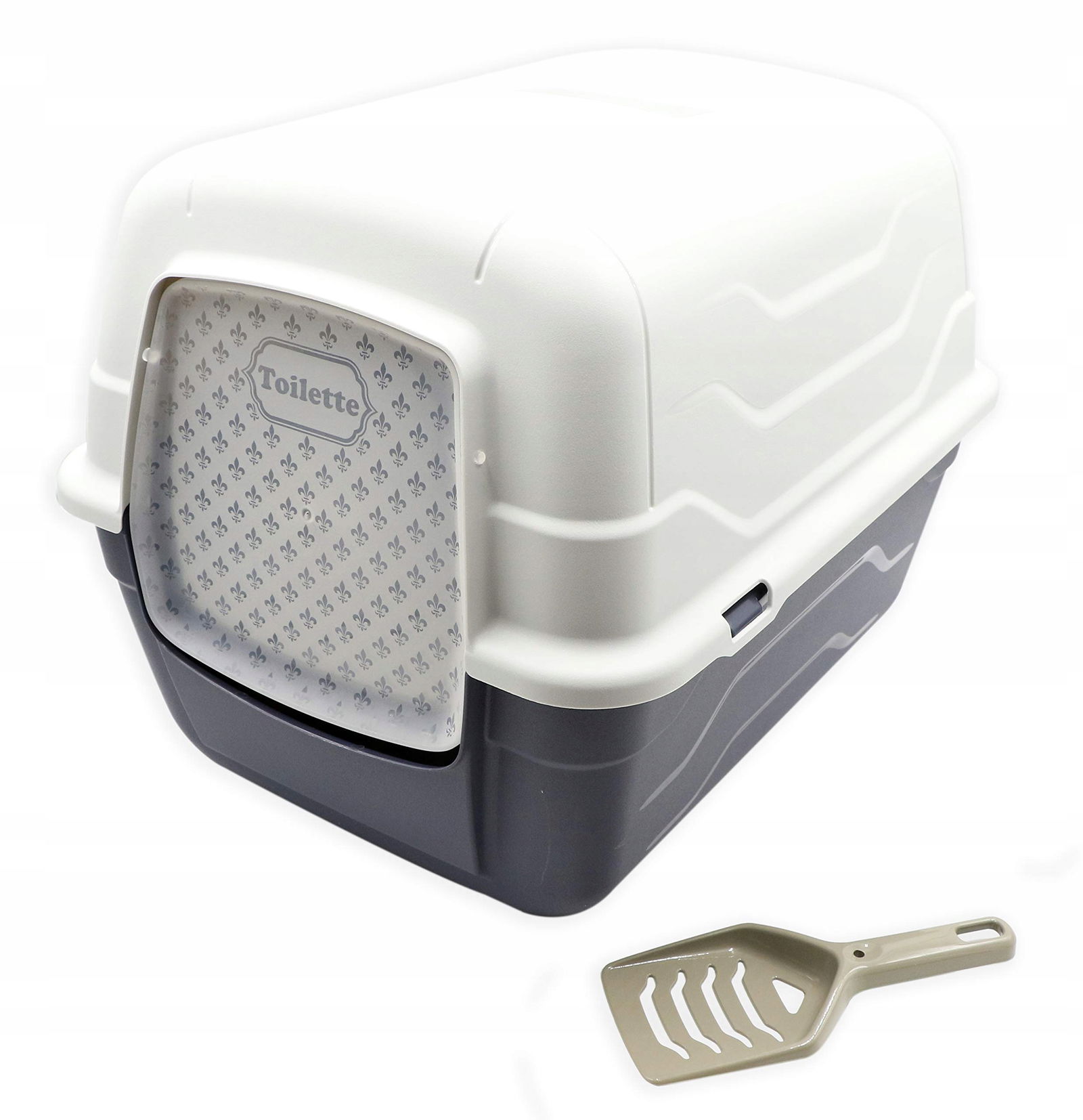 - Domek dla kota Aimé jest wyposażony w otwierany dach, drzwi na zawiasach, filtr węglowy do kontroli zapachów, wpuszczany uchwyt do transportu i łopatkę