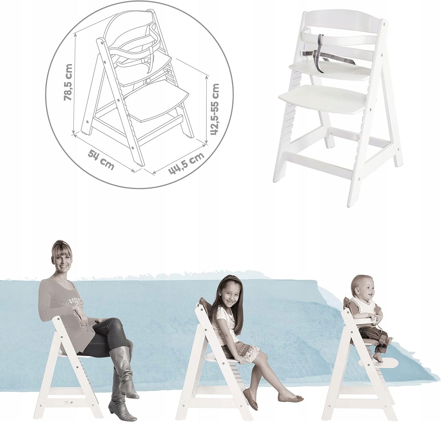 Dzięki systemowi pasów bezpieczeństwa oraz drążkowi ochronnemu, krzesełko doskonale nadaje się dla dzieci od najmłodszych lat. Wygodne oparcie z formowanego drewna zapewnia ergonomiczną postawę podczas jedzenia, a dodatkowe schodki ułatwiają maluchom samodzielne wsiadanie.