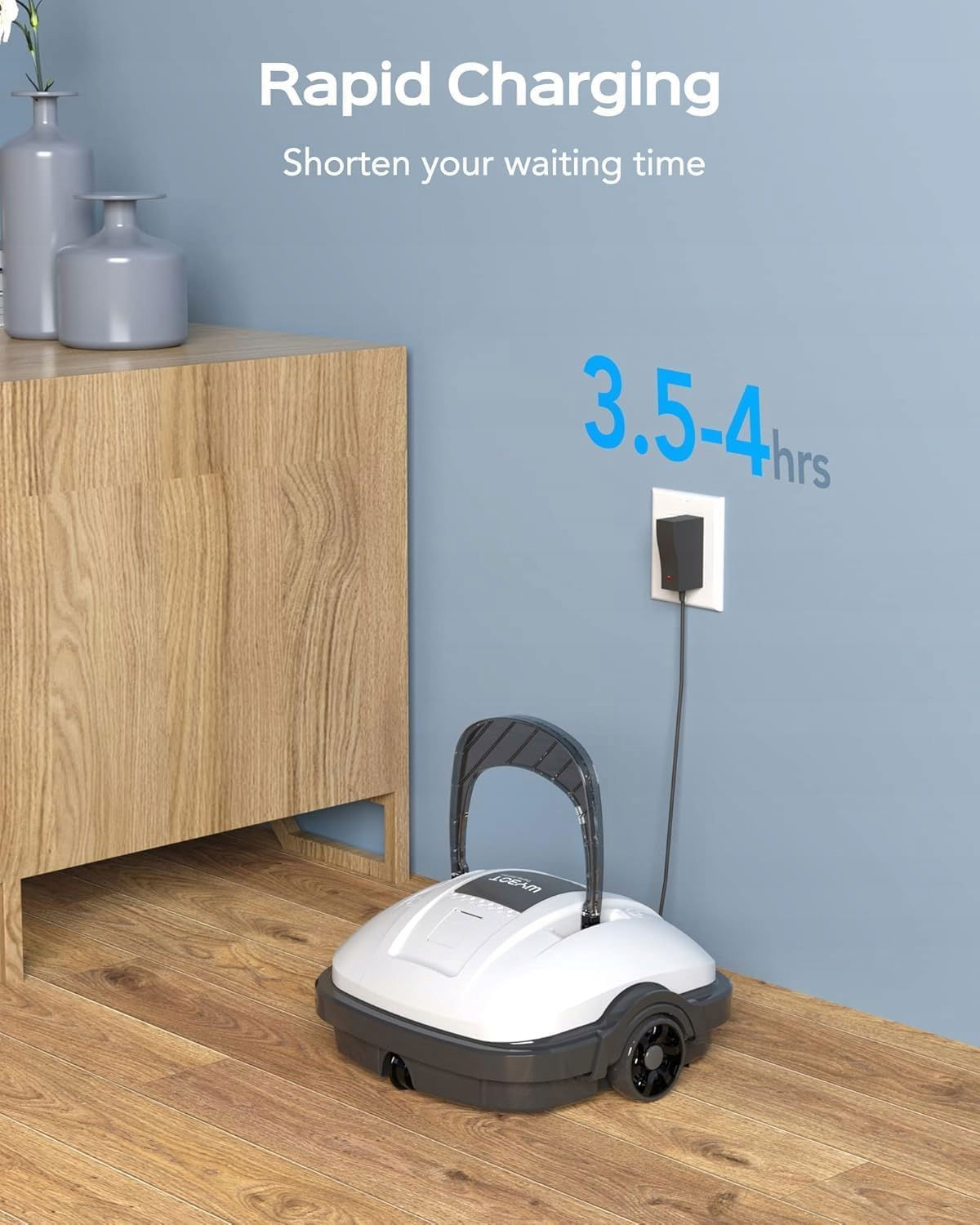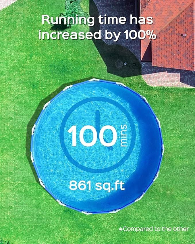 Niezawodny akumulator: robot basenowy WYBOT jest wyposażony w akumulator litowy o pojemności 5200 mAh, który umożliwia bezprzewodowe czyszczenie do 100 minut. Dzięki technologii szybkiego ładowania, pełne naładowanie zajmuje zaledwie 3,5 do 4 godzin. Ten odkurzacz idealnie nadaje się do basenów naziemnych i podziemnych z płaskim dnem o powierzchni do 80 m².