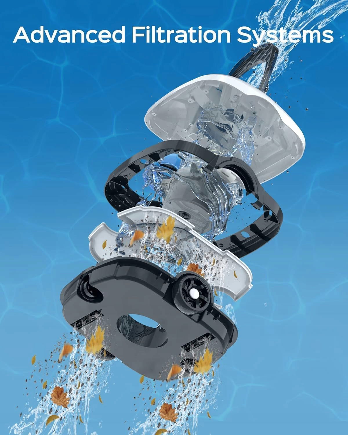 Inteligentna technologia parkowania: robot basenowy automatycznie wraca po uderzeniu w ścianę. Przy niskim poziomie naładowania baterii system automatycznie wraca robota na brzeg. Ten w pełni automatyczny odkurzacz basenowy czyści każdy rodzaj powierzchni basenowej (PCV, płytki, winyl lub beton) i kształty (okrągłe, prostokątne lub owalne) za naciśnięciem jednego przycisku.