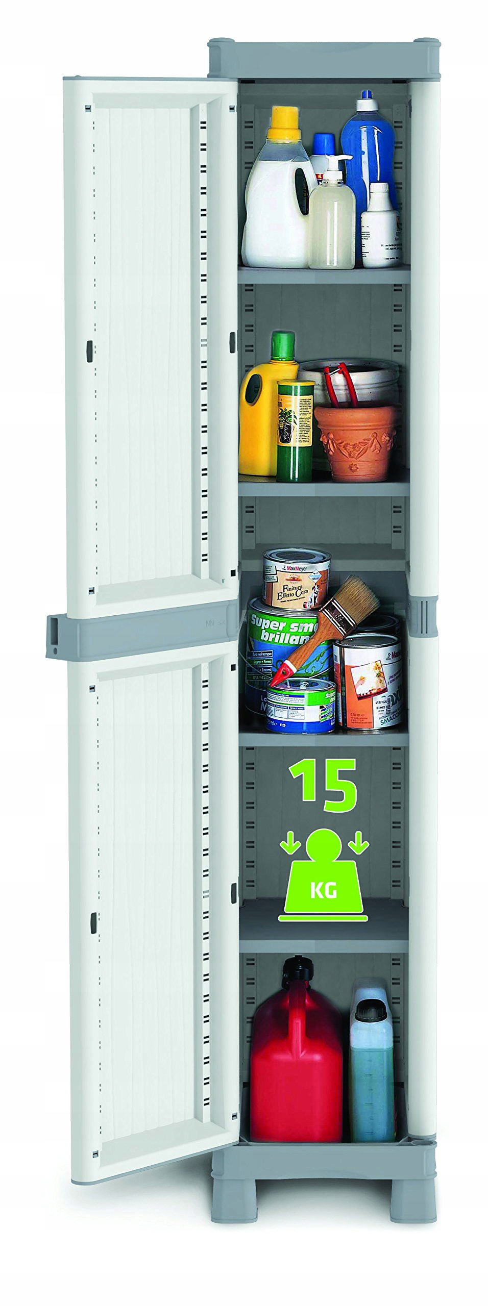 - nazwa przedmiotu: Terry, Base 2350 RUW, szafka z 1 drzwiami i 4 półkami, do wewnątrz i na zewnątrz. Kolor: szary, materiał: tworzywo sztuczne, wymiary: 35x43,8x181,8 cm, jasnoszara/ciemnoszara