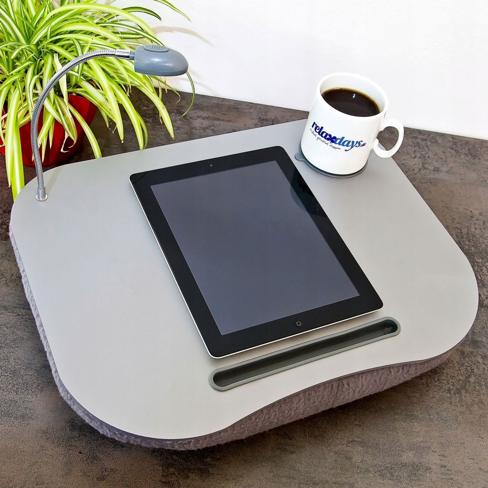 W wygodny sposób połóż Twojego laptopa na kolanach. Podstawka pod laptopa z poduszką wypełnioną silikonowym granulatem przekonuje nie tylko swoim anatomicznym kształtem, ale i dostatecznym dostępem powietrza. Praktyczny stolik wyposażony jest także w energooszczędną lampkę LED i dodatkowe otwory na napoje oraz długopisy.