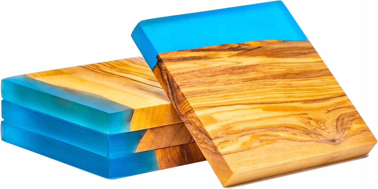 Erreke Zestaw 4 Podstawek z Drewna Oliwnego I Żywicy Epoksydowej, Drewniane Podstawki Pod Napoje, 10x10x1,2 cm (Niebieski)
