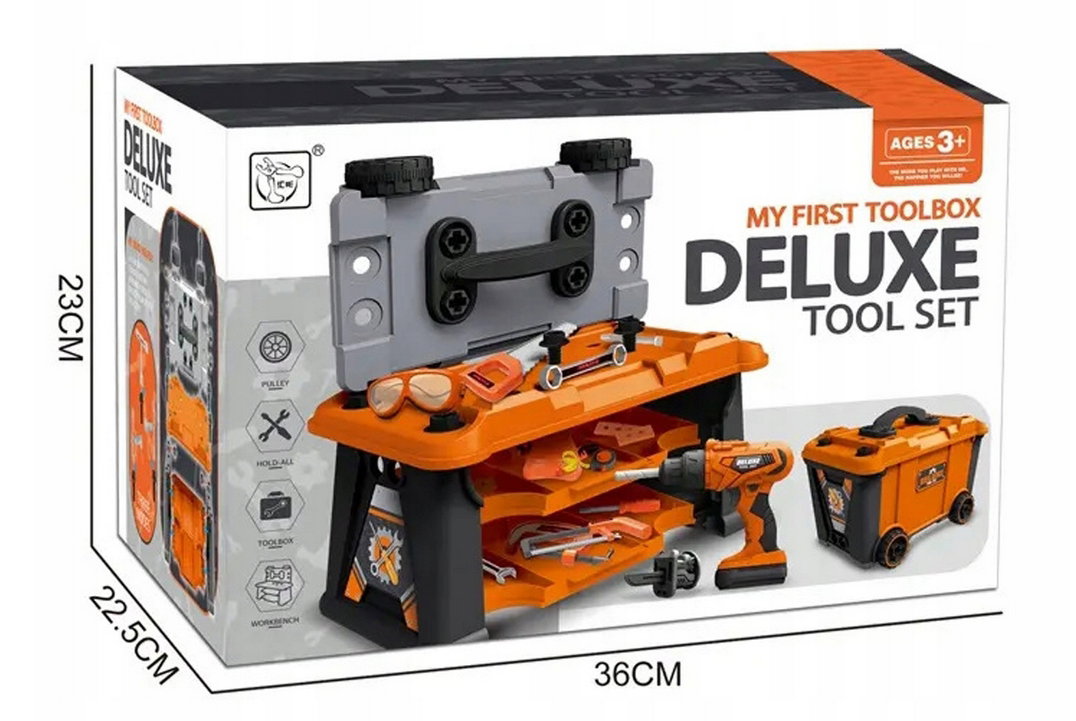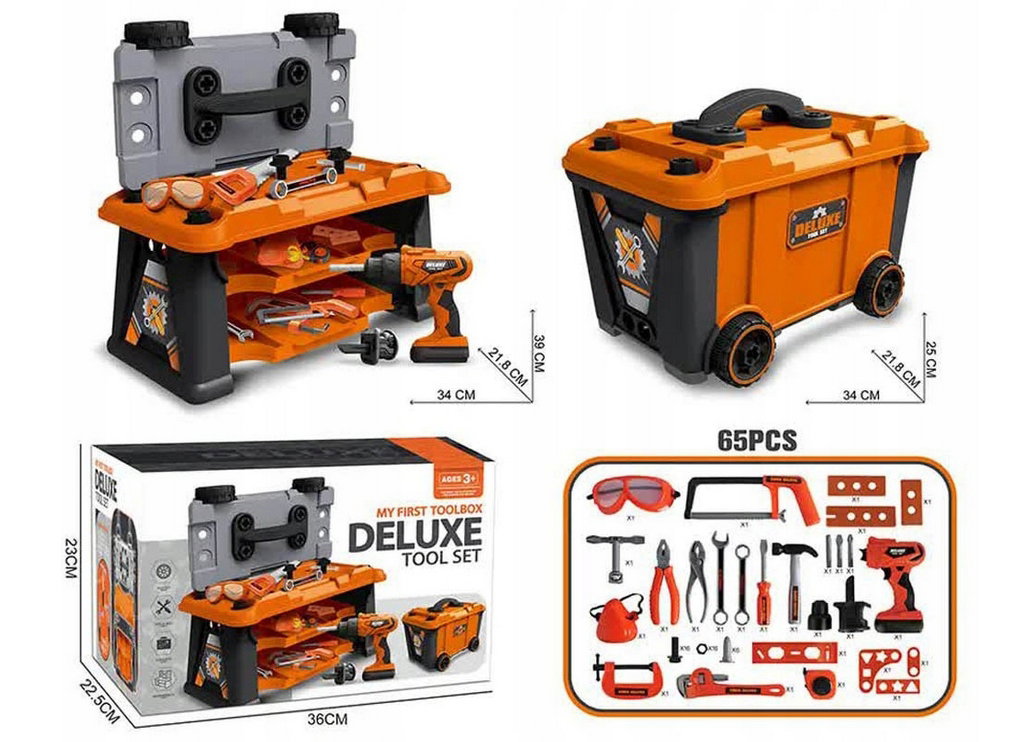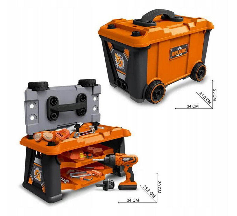 Mini warsztat: Dzięki funkcji rozkładanej skrzyni dzieci mogą stworzyć własny stół warsztatowy, na którym będą pracować jak prawdziwi profesjonaliści.