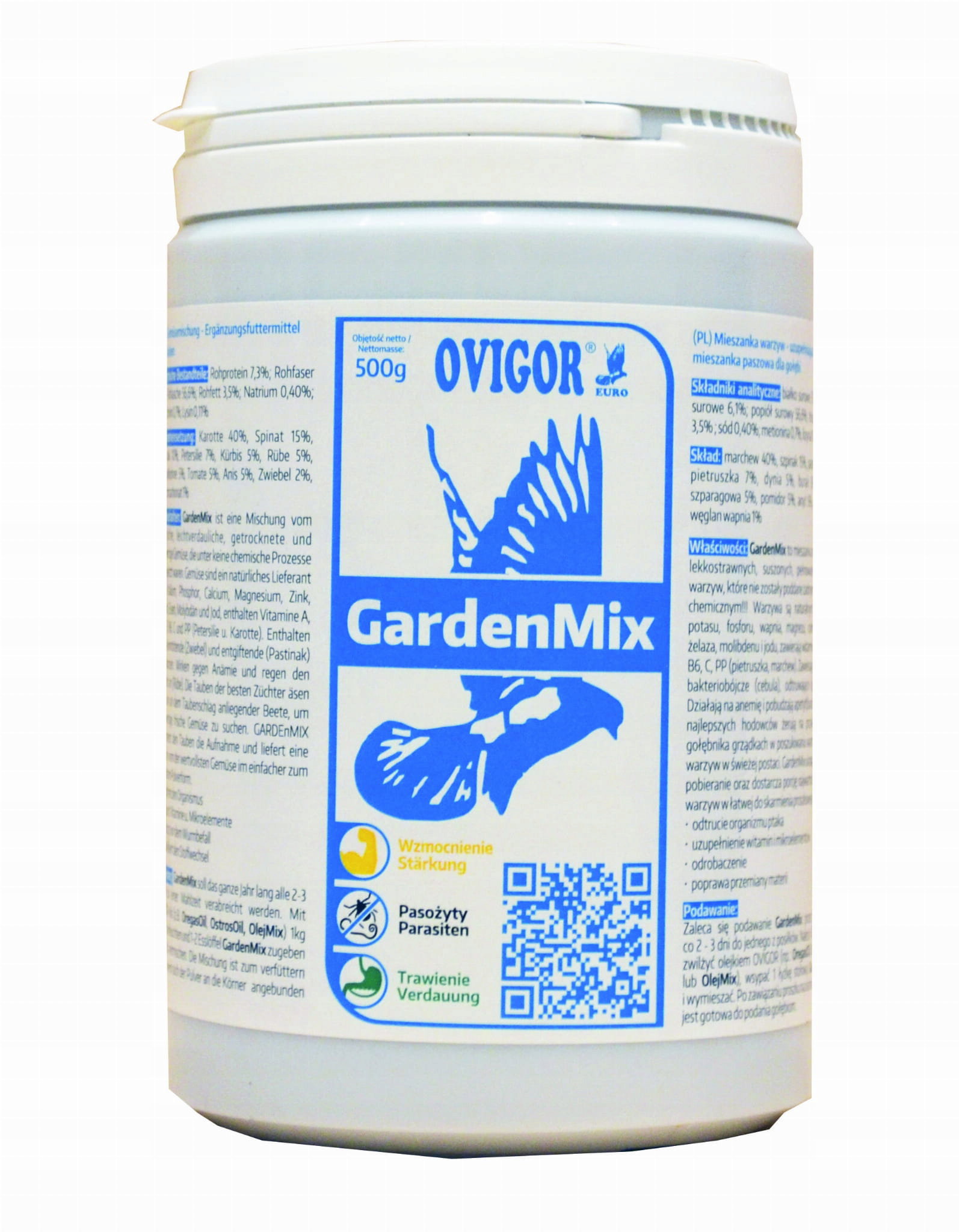 Gołębie najlepszych hodowców żerują na przyległych do gołębnika grządkach w poszukiwaniu wartościowych warzyw w świeżej postaci. GardenMix ułatwia ptakom pobieranie oraz dostarcza porcję najwartościowszych warzyw w łatwej do skarmienia proszkowej postaci.