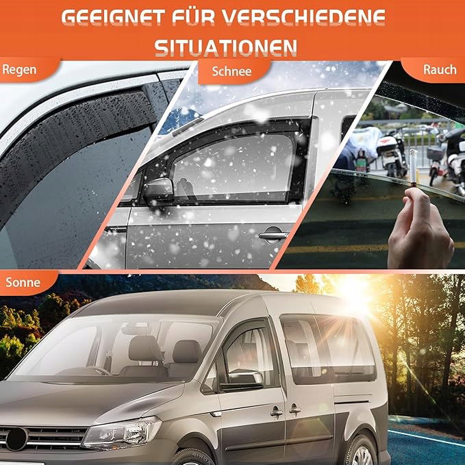 - Umożliwia przenikanie świeżego powietrza i redukuje szum wiatru. Owiewki do Volkswagena Caddy są aerodynamicznie zaprojektowane w 3D, aby zmniejszyć hałas wiatru. Jednocześnie kierują przepływ powietrza, dzięki czemu wnętrze pojazdu pozostaje wolne od dymu, stęchłego powietrza i zaparowanych szyb. Odprowadzają również deszcz z dala od okna, podczas gdy świeże powietrze może nadal przepływać