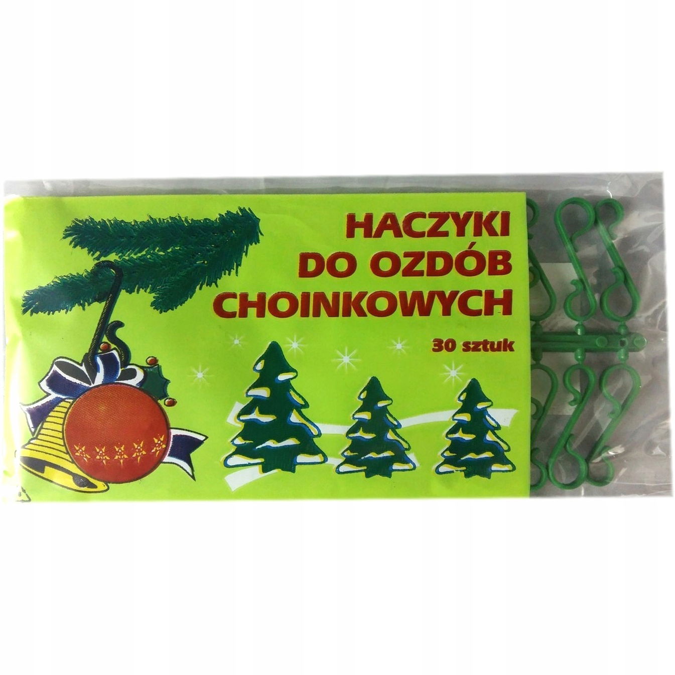 Haczyki do zawieszania ozdób choinkowych, wykonane z trwałego plastiku, długość 3 cm. Zielona zawieszka zapewnia estetyczny wygląd i łatwe mocowanie dekoracji. Zestaw 30 sztuk, zapakowany w woreczek ochronny.