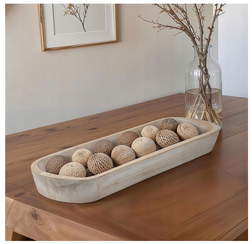 - Dołączone komponenty: Winter Shore Ozdobna długa drewniana misa, ręcznie rzeźbiona z drewna paulownia