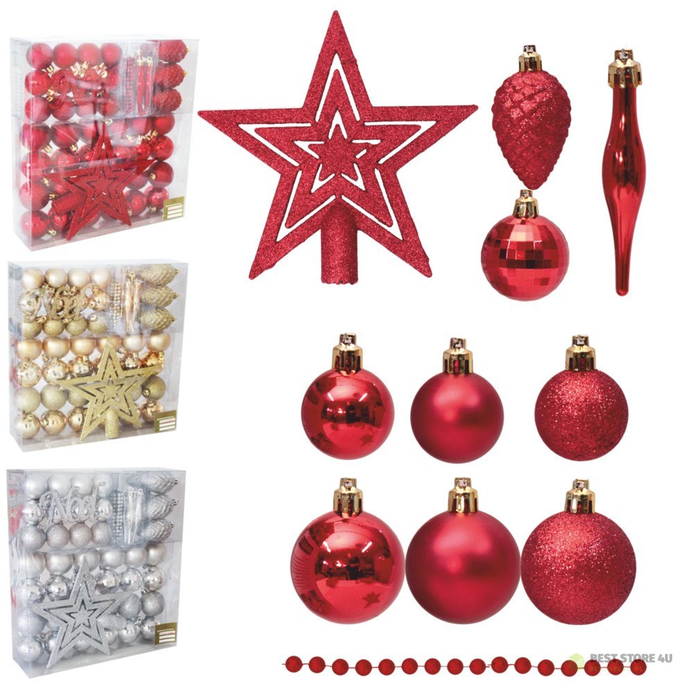 Kolekcja Classy to bombki w tradycyjnych bożonarodzeniowych kolorach - złotym, srebrnym i czerwonym. Komplet zawiera bombki w kilku rodzajach, które pozwalają ubrać świąteczne drzewko w klasyczny sposób. Bombki są nietłukące, dzięki czemu nie stwarzają zagrożenia w domu pełnym dzieci :)Zestaw zawiera: Bombki w różnych rodzajach Girlanda (koraliki) Szpic - gwiazdkę