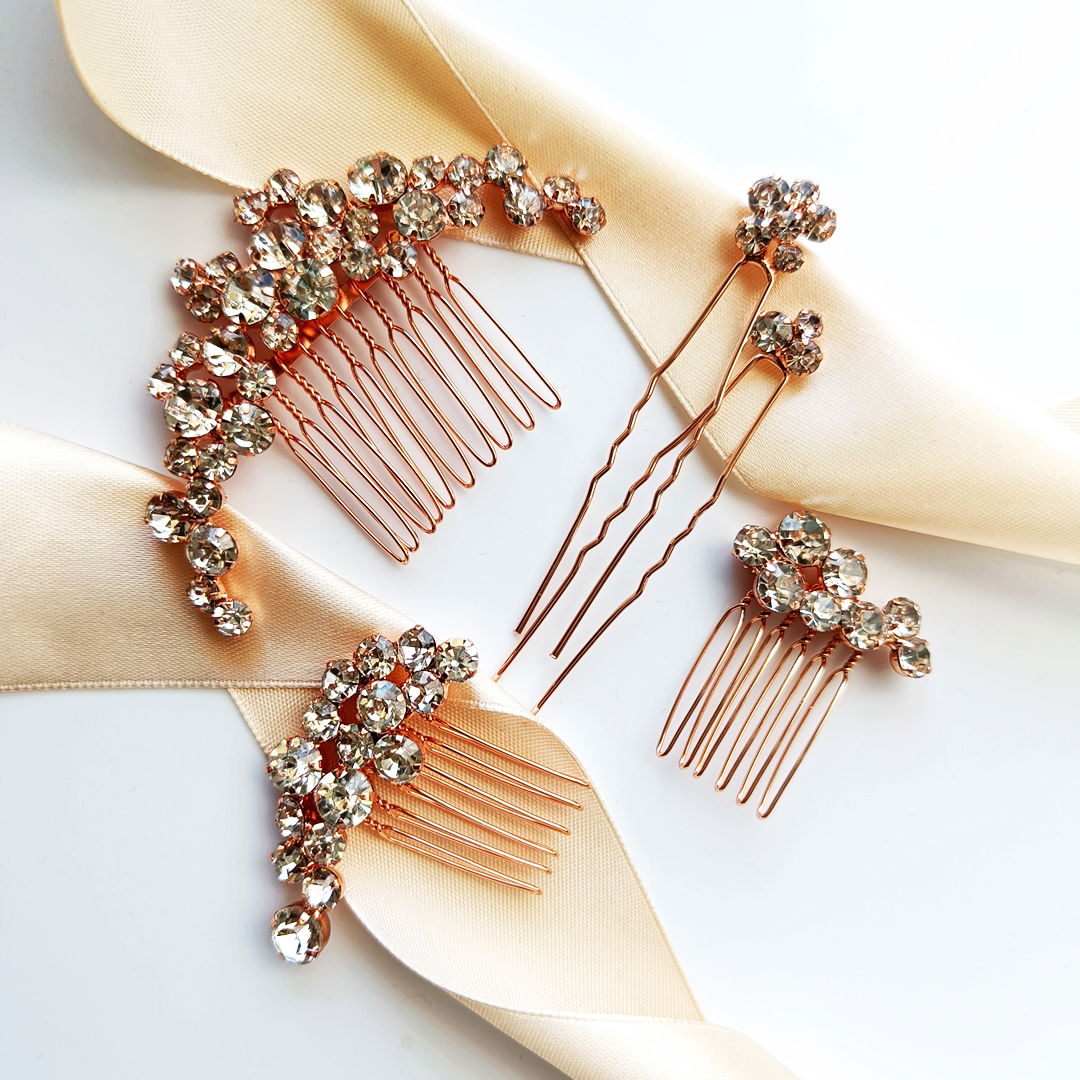 Piękny i elegancki zestaw ozdób do włosów w różowym złocie z powodzeniem doda blasku efektownej fryzurze ślubnej i nie tylko. Komplet składa się z trzech grzebyków o różnych wielkościach oraz dwóch kokówek, które pięknie się uzupełniają. Z tymi ozdobami możesz spokojnie budować efekt używając tylko jednego grzebyka, lub stworzyć zjawiskową konstrukcję przy użyciu całego zestawu.