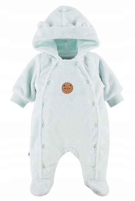Pajac ocieplany niemowlęcy uszyty z miękkiego i przyjemnego w dotyku materiału. Podszewka w pajacyku jest bawełniana. Na przodzie znajduje się niewielka aplikacja przedstawiająca misia. Pajac jest rozpinany na bokach, dzięki czemu łatwo ubrać w niego maluszka. Kombinezon ma kapturek, który ochroni główkę dziecka przed wiatrem i deszczem. Pajac będzie tworzył śliczne ubranko wyjściowe na chłodniejsze dni.