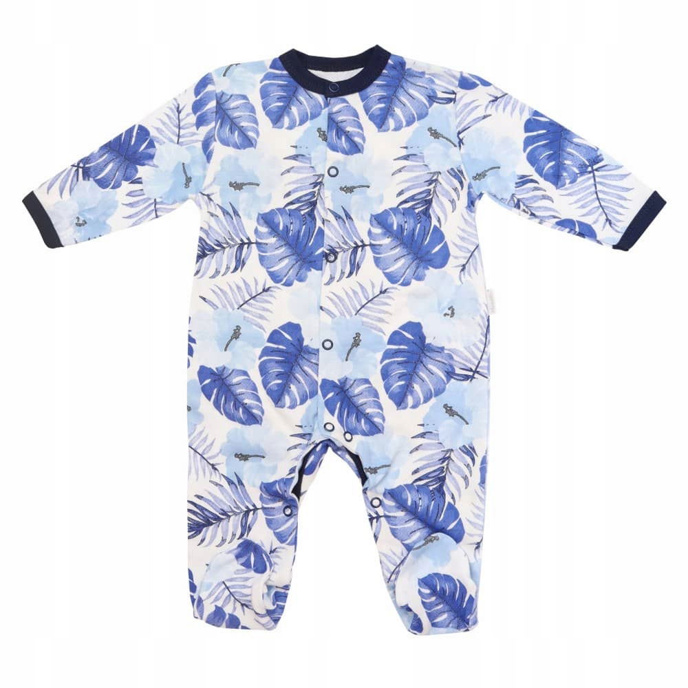 Uszyty z miękkiej, przyjemnej w dotyku, organicznej, wysokogatunkowej tkaniny bawełnianej. Zapinany wzdłuż tułowia i po wewnętrznej stronie nóg na bezniklowe napy.