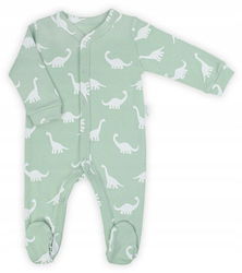 Bawełniany pajacyk z długim rękawem dla chłopca, zakończony ściągaczem i stópkami. Zapinany wzdłuż całego ubranka na wygodne napy, by ułatwić przewijanie dziecka. Występuje w kolorystyce miętowej w białe dinozaury. Luźny fason zapewni komfort każdemu maluszkowi.