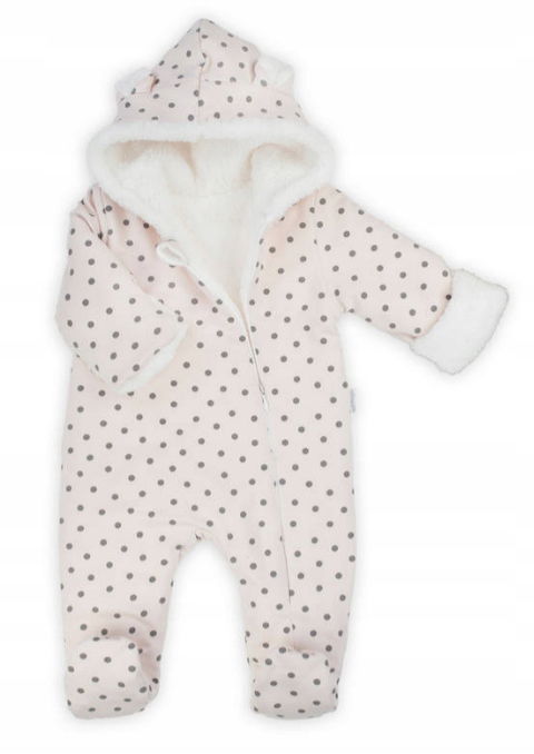Pajac ocieplany uszyty z wysokogatunkowego materiału. Podszyty delikatnym futerkiem, sprawia, że ubranko idealnie nadaje się na chłodne dni. Całość zdobi kaptur z uszkami. Ubranko posiada zawijane rękawy aby na dworze ochronić rączki dziecka przed zimnem.