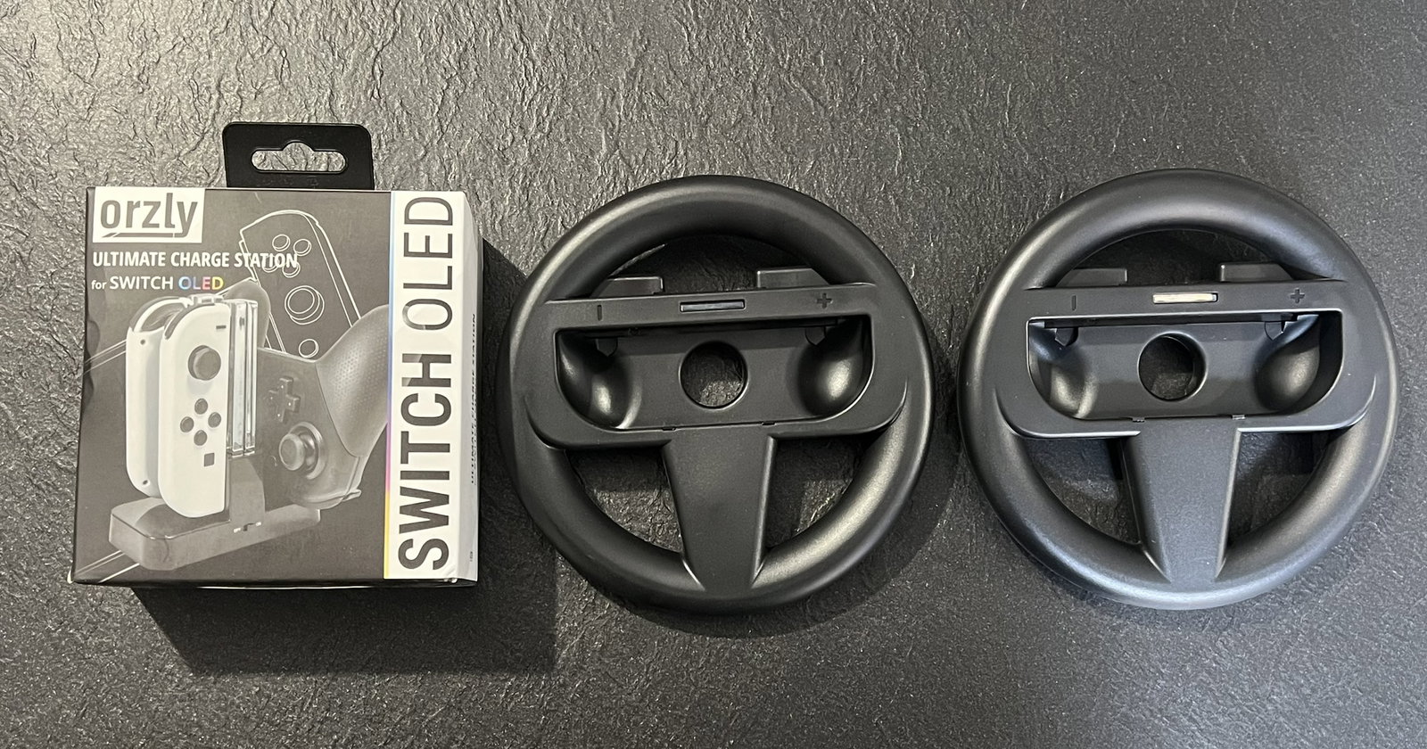 Orzly Geek Pack pakiet akcesoriów kompatybilny z Nintendo Switch: Etui i osłona ekranu, uchwyty Joycon i kierownice wyścigowe, stacja ładująca kontroler, pokrowiec i więcej, kolor: czarny, JetBlack