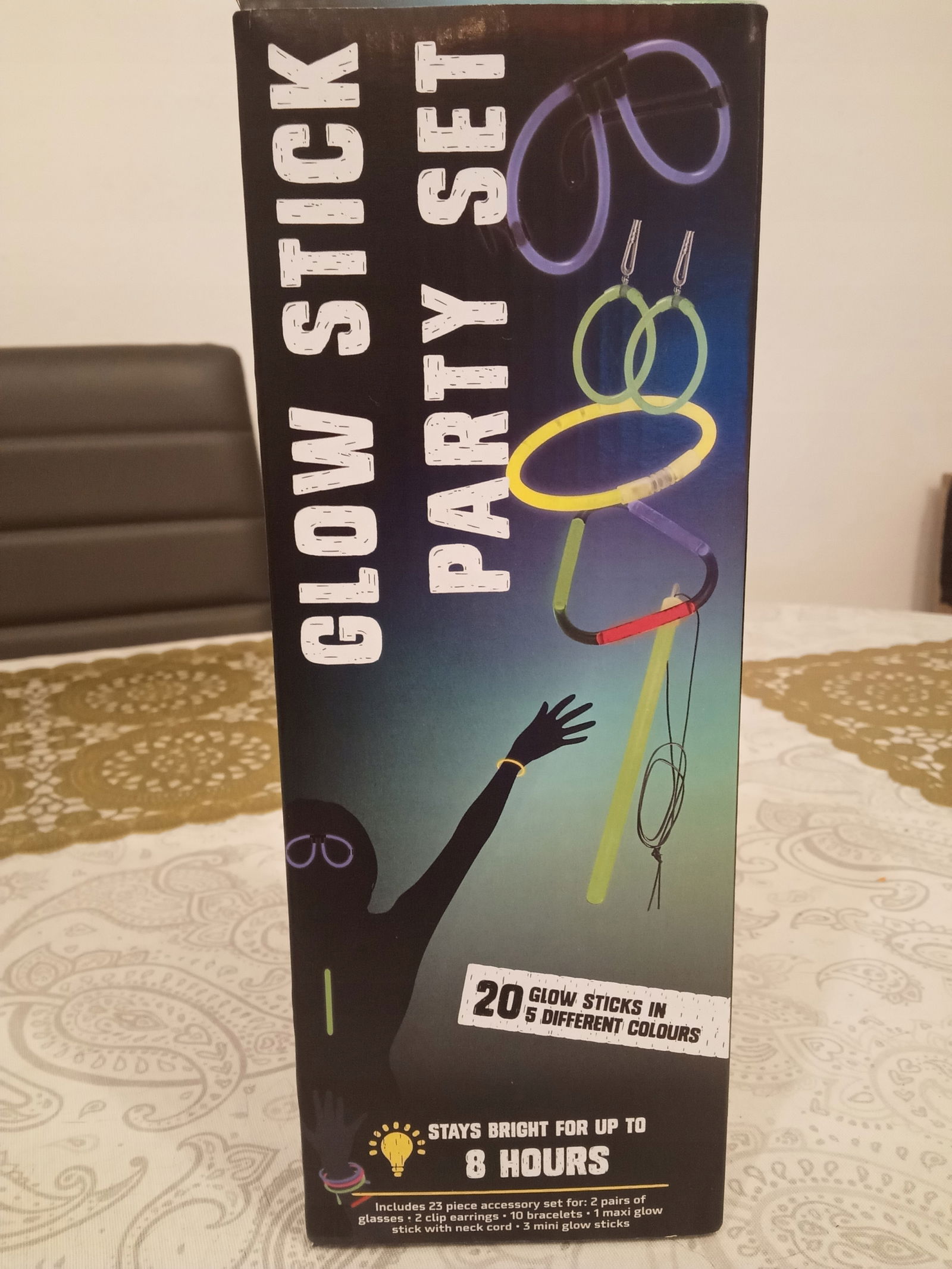 Do wykonania intensywnie świecących dodatków na imprezę. 20 pałeczek świecących w 5 kolorach. W zestawie 23-częściowe akcesoria: 2 pary okularów, 2 pary klipsów, 10 bransoletek, 1 duża świetlna pałeczka na szyję, 3 małe pałeczki świetlne. Czas świecenia do 8 godzin.