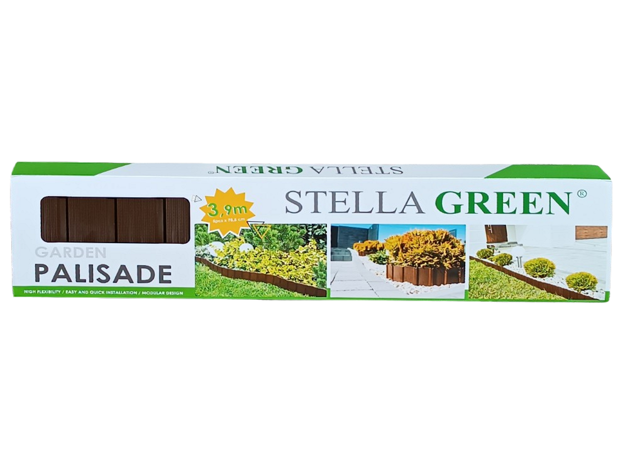 Palisada ogrodowa marki Stella Garden składająca się z 5 odcinków o łącznej długości 390cm (5x78,5cm) i wysokości 10,5cm (wysokość całkowita z trzpieniem 17,5cm). Produkt posiada prosty system łączenia modułów, duża elastyczność pozwala na szybkie i wygodne formowanie kształtu, dzięki czemu palisada ma szerokie zastosowanie na działce i w ogrodzie.
