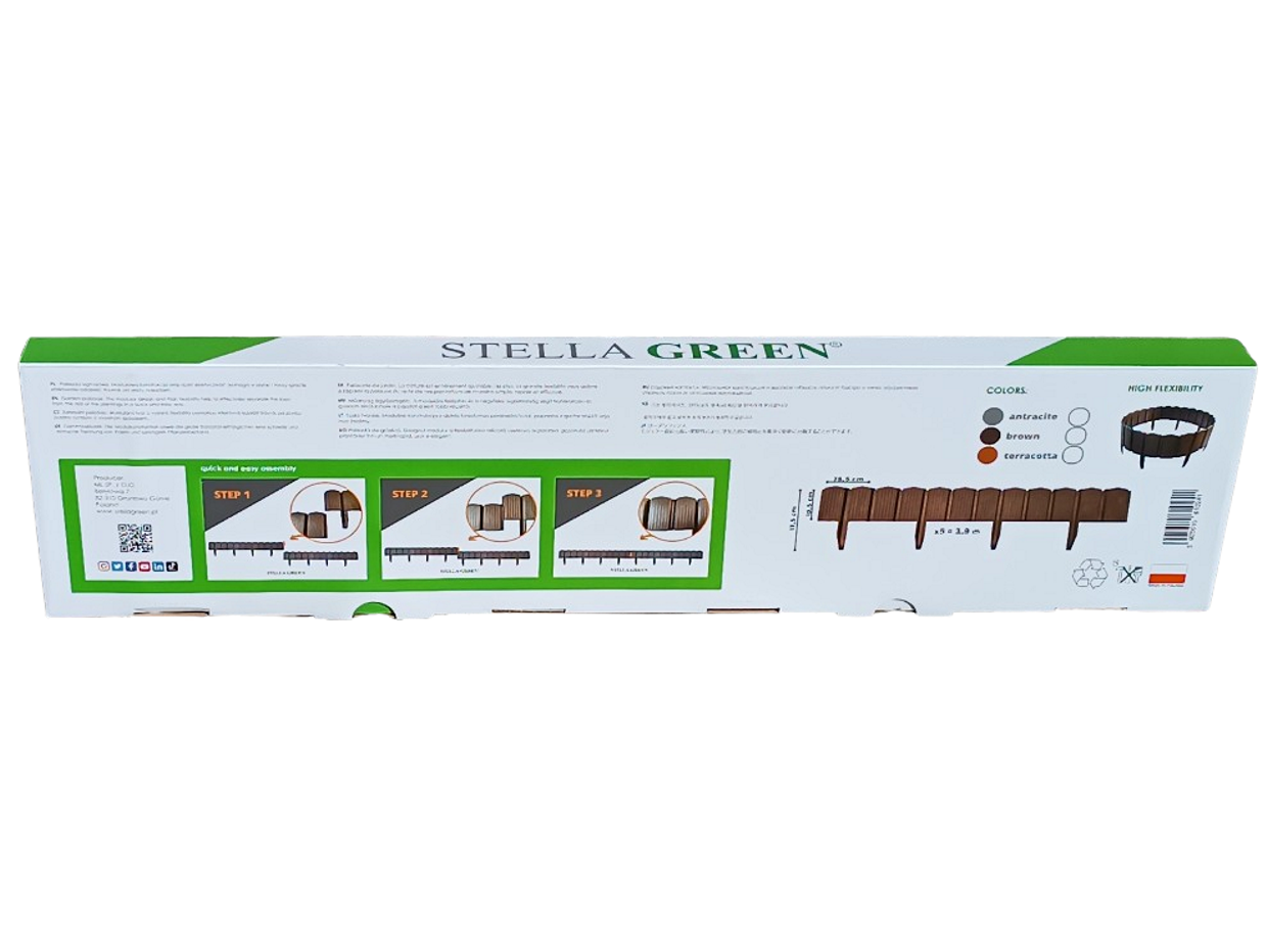 Palisada ogrodowa marki Stella Garden składająca się z 5 odcinków o łącznej długości 390cm (5x78,5cm) i wysokości 10,5cm (wysokość całkowita z trzpieniem 17,5cm). Produkt posiada prosty system łączenia modułów, duża elastyczność pozwala na szybkie i wygodne formowanie kształtu, dzięki czemu palisada ma szerokie zastosowanie na działce i w ogrodzie.