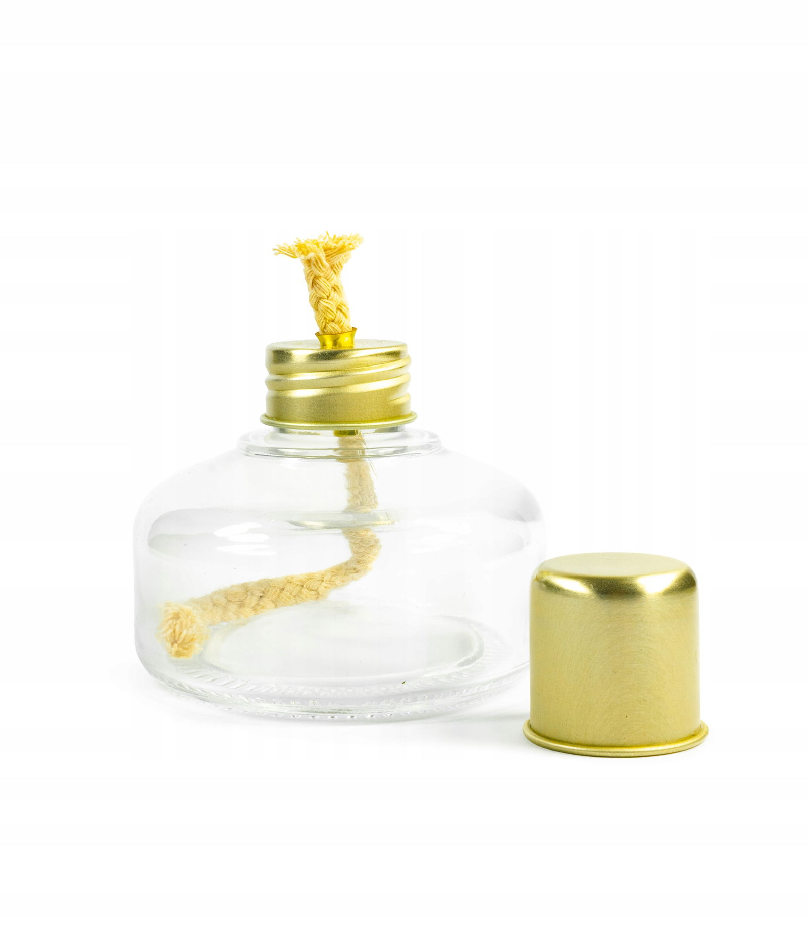 Szklany palnik spirytusowy. Wykonany ze szkła sodowo-wapniowego. W zestawie z metalowym kołpakiem i knotem.