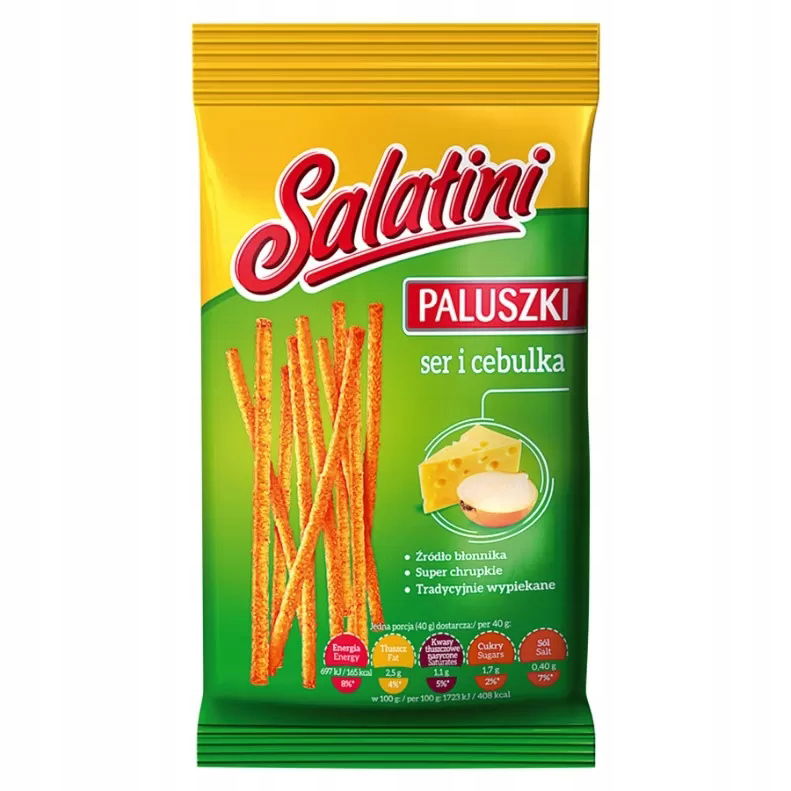 Paluszki serowo-cebulowe marki Salatini to produkt, w którego składzie znajdziemy m.in. suszoną cebulkę (2%), mąkę pszenną i drożdże. Na uwagę zasługuje stosunkowo wysoka zawartość białka (12 g w 100 g). Cebólka i ser nadają paluszkom wyjątkowego smaku, który uwielbiają zarówno dzieci, jak i osoby dorosłe. To produkt, który można mieć zawsze przy sobie i sięgnąć po niego w dowolnej chwili. Będzie również niezastąpiony na imprezach. Paluszki z sezamem marki Salatini cieszą się dużym zainteresowaniem - spraw, by klienci znaleźli je również u Ciebie i już dziś złóż zamówienie na naszej stronie internetowej.
