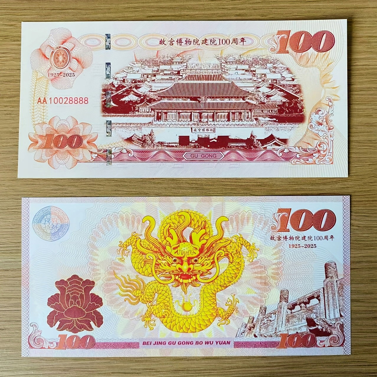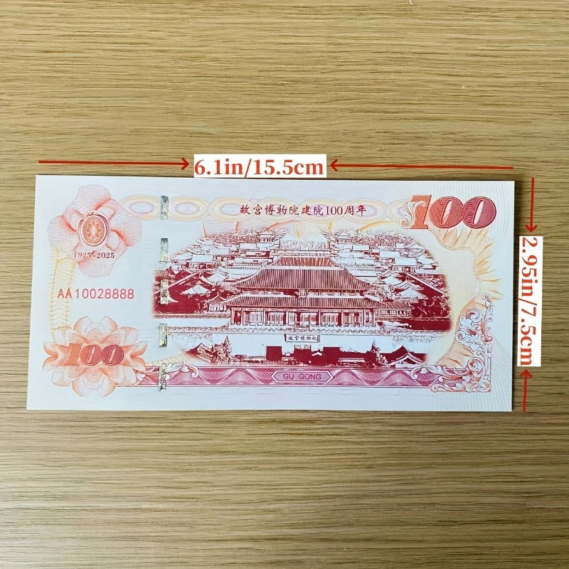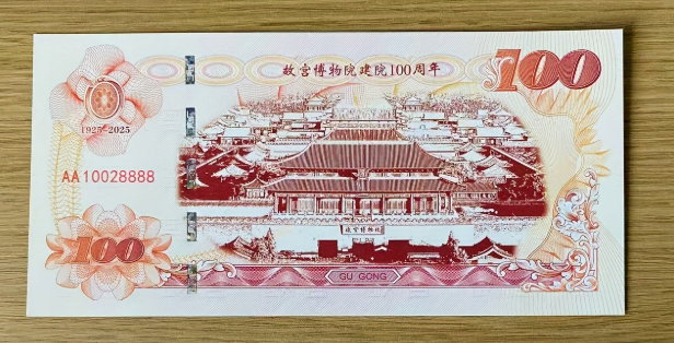 - Napisy:W prawej górnej części: "故宫博物院建院100周年" (100-lecie założenia Muzeum Pałacowego).Pod tym napisem: "1925-2025".Na dole banknotu: "BEI JING GU GONG BO WU YUAN" (Muzeum Pałacowe w Pekinie).
