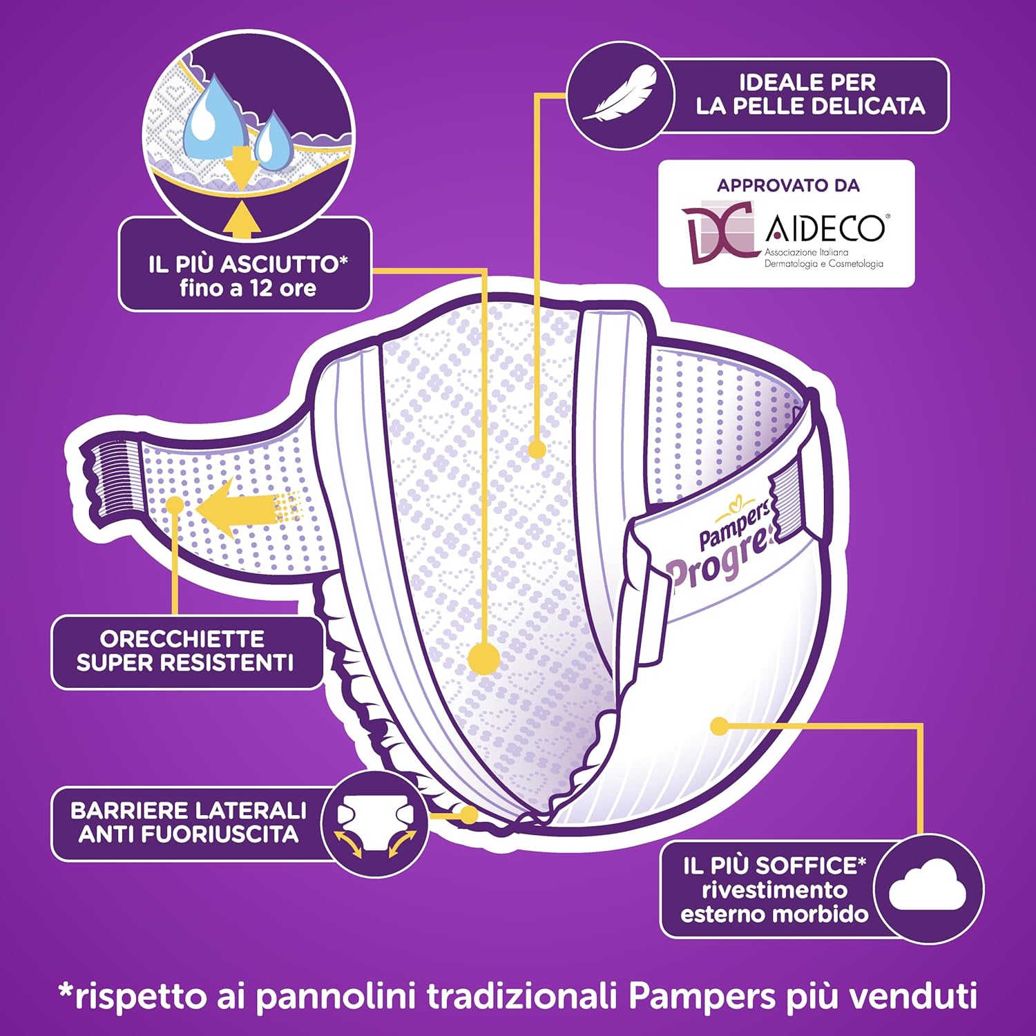 pieluchy Pampers Progressi mają unikalną i super chłonną technologię, która zachowuje swój kształt - zawsze pozostają cienkie - nawet po wchłonięciu zbyt dużej ilości siusiu