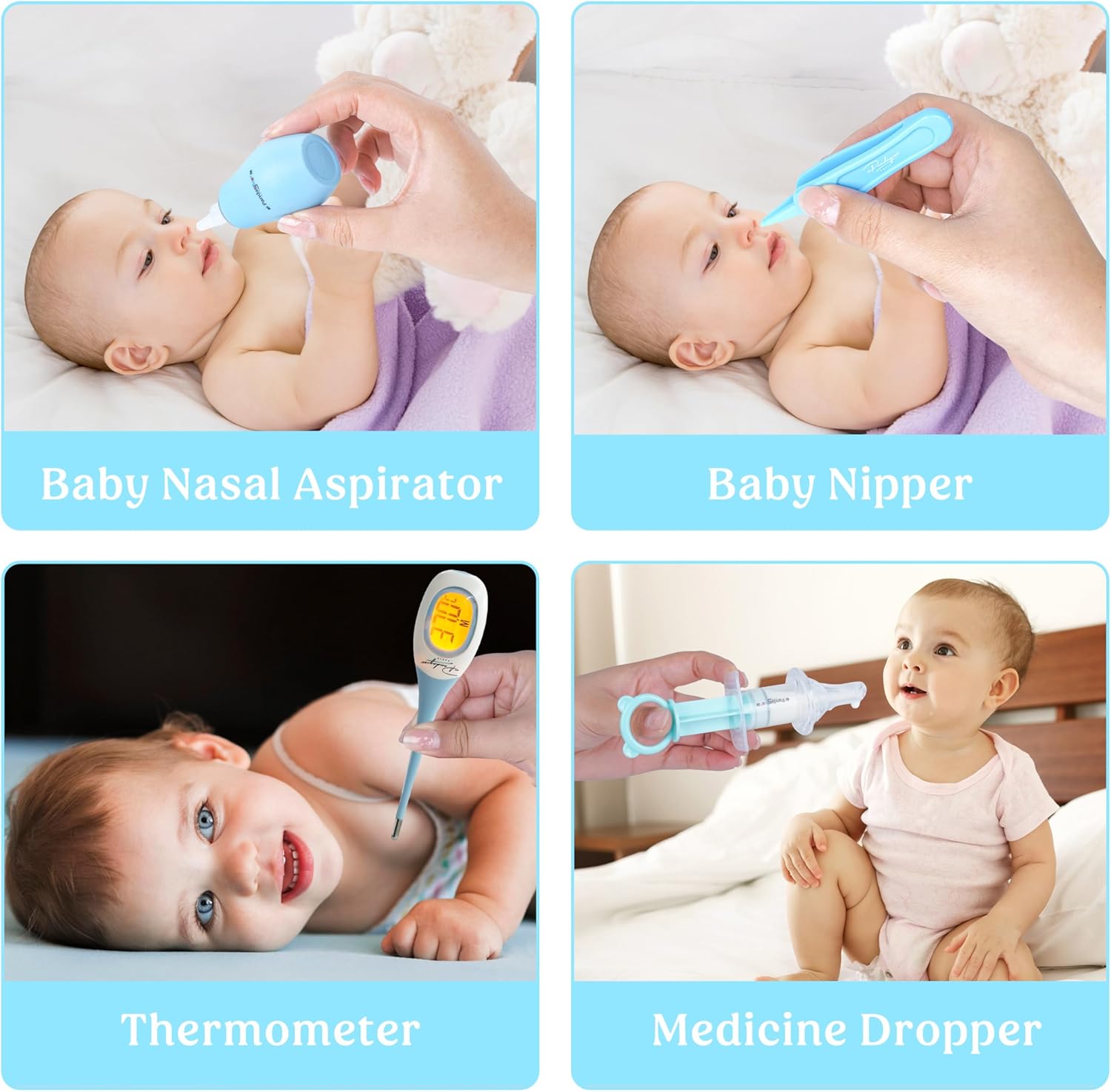 Nos dziecka, strzykawka do nosa, irygator do nosa, termometr cyfrowy, elektryczny pilnik do paznokci dla dzieci (baterie nie są dołączone), pipeta, grzebień, szczoteczka, termometr do kąpieli, pęseta do nosa, nożyczki, obcinacz do paznokci dla dzieci i ręczny pilnik do paznokci.