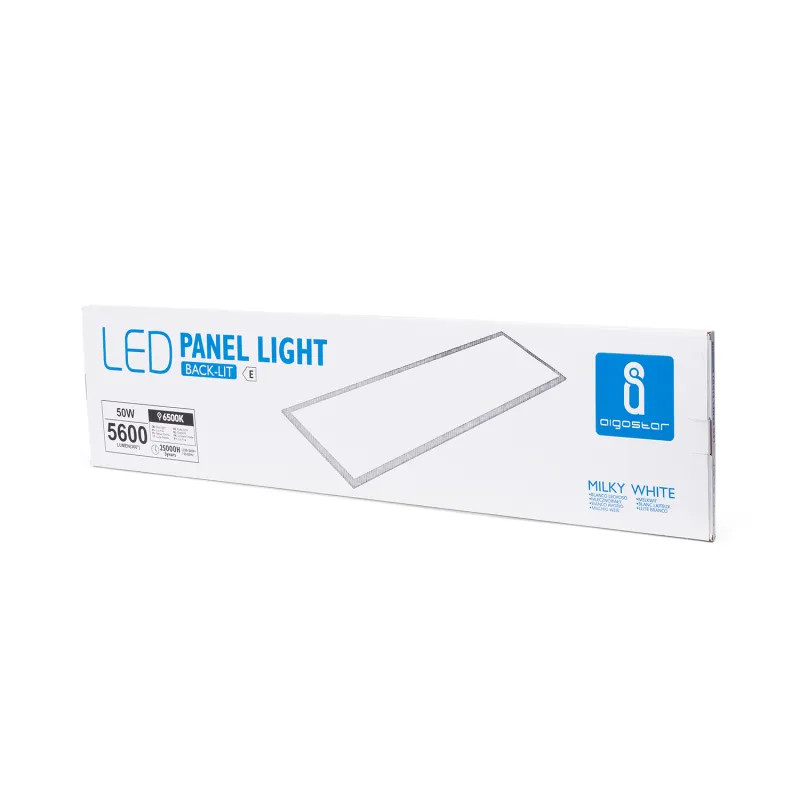 Zestaw zawiera gotowy do montażu prostokątny kaseton 30x120 cm plafon podtynkowy o mocy 50 w 5600 lm i białej zimnej barwie światła. Panel w zestawie z zasilaczem sieciowym na 230V.