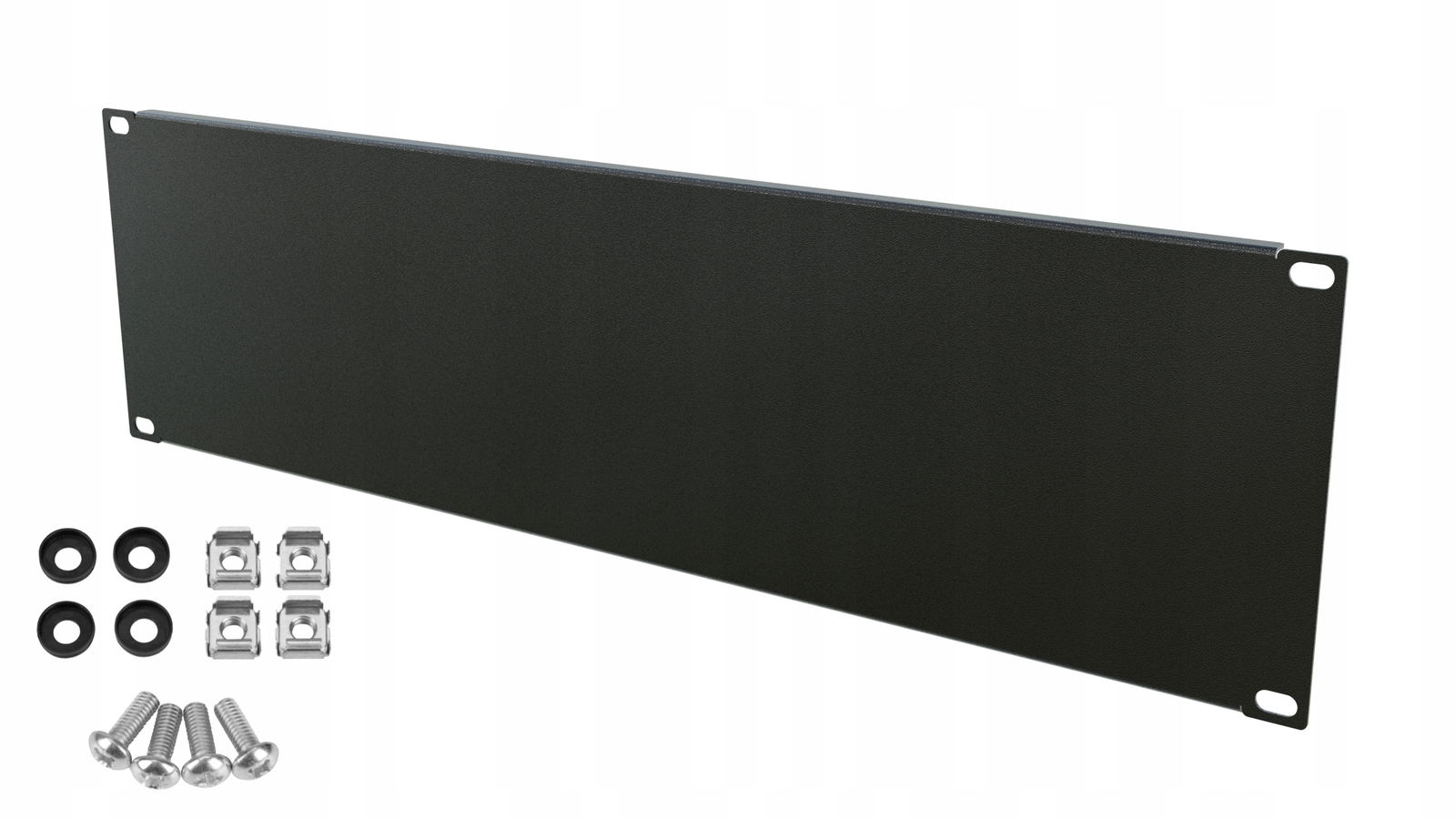 Maskownica RACK 19" 3U w wersji pojedynczej, dostarczana z kompletem śrub C4. Idealna do estetycznego wykończenia instalacji. Dzięki dołączonemu zestawowi śrub montaż jest szybki i łatwy.